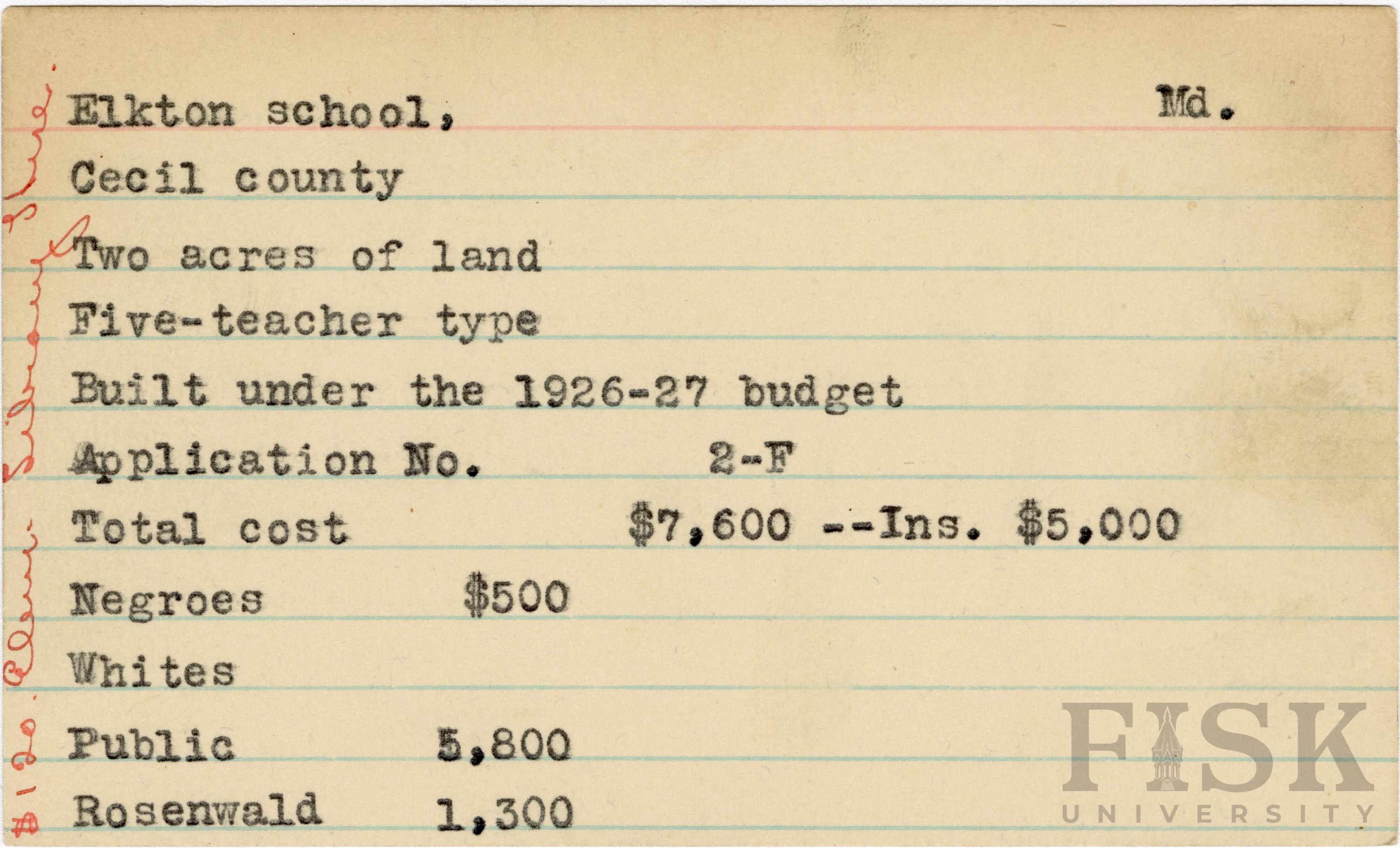 - School card from Rosenwald Fund for Elkton School in Cecil County, Maryland with a section added to the budget contributions that says, "Ins. $5,000" and a handwritten note on the far left of the card that says, "$120 elem library here"