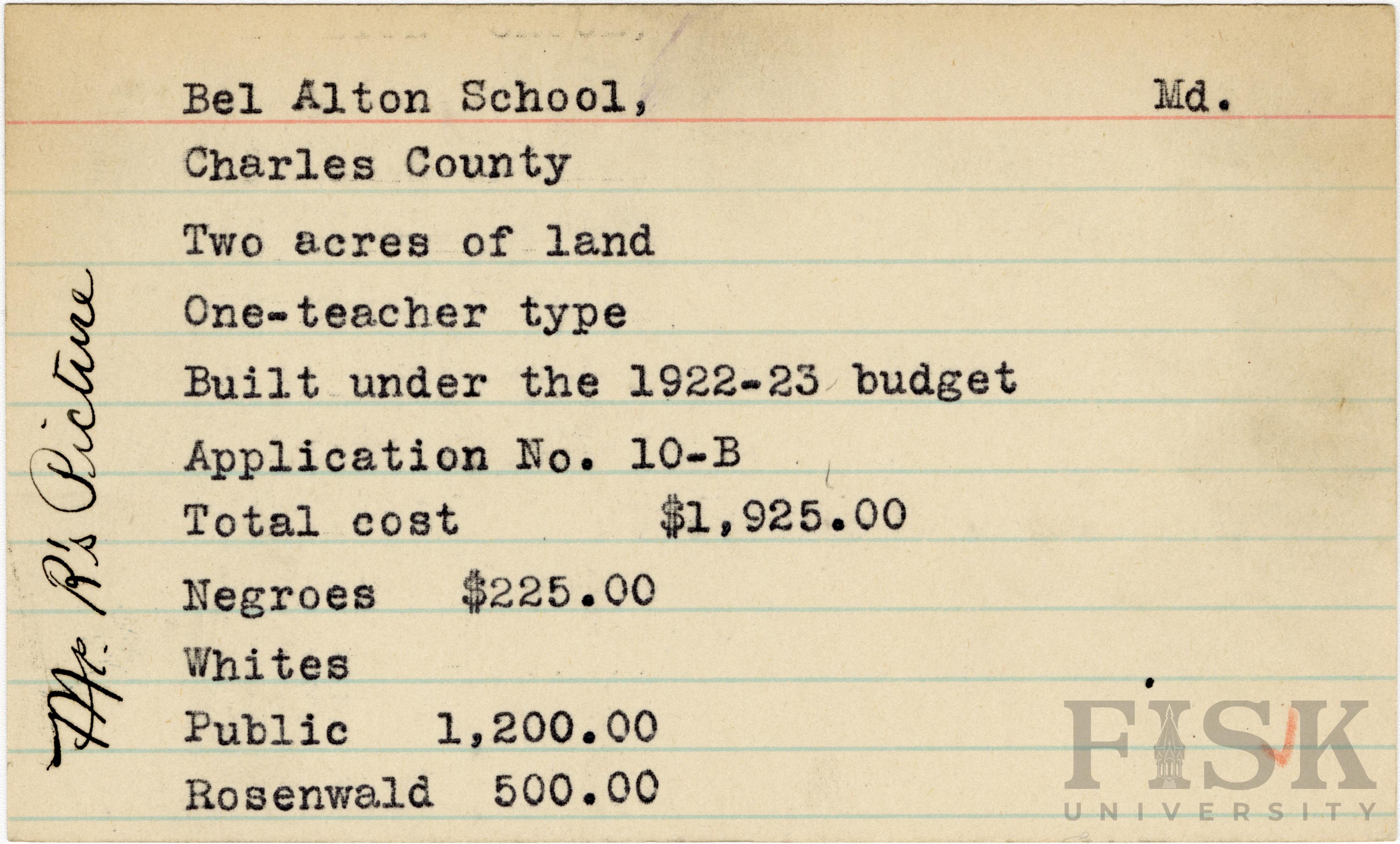 School card from Rosenwald Fund for Bel Alton School in Charles County, Maryland with a handwritten note on the far left of the card that says, "Mr. R's Picture"
