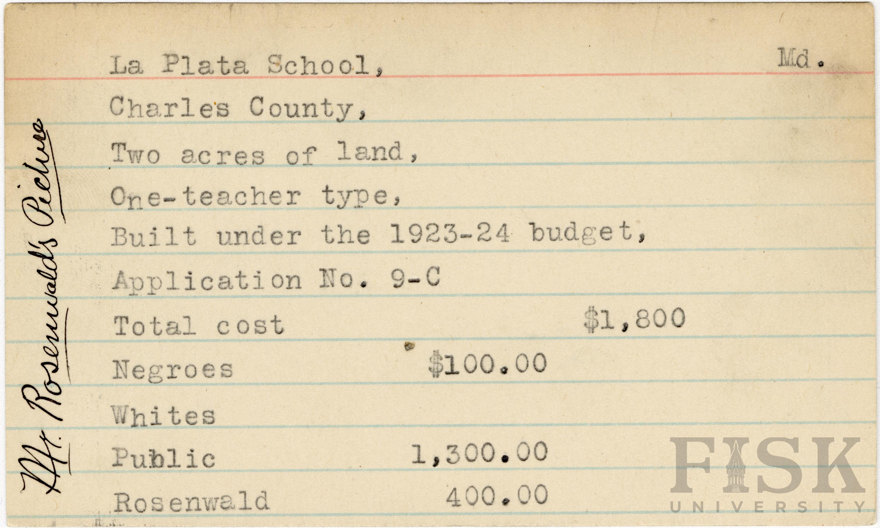 - School card from Rosenwald Fund for La Plata School in Charles County, Maryland with a handwritten note on the far left of the card that says, "Mr. Rosenwald's Picture"
