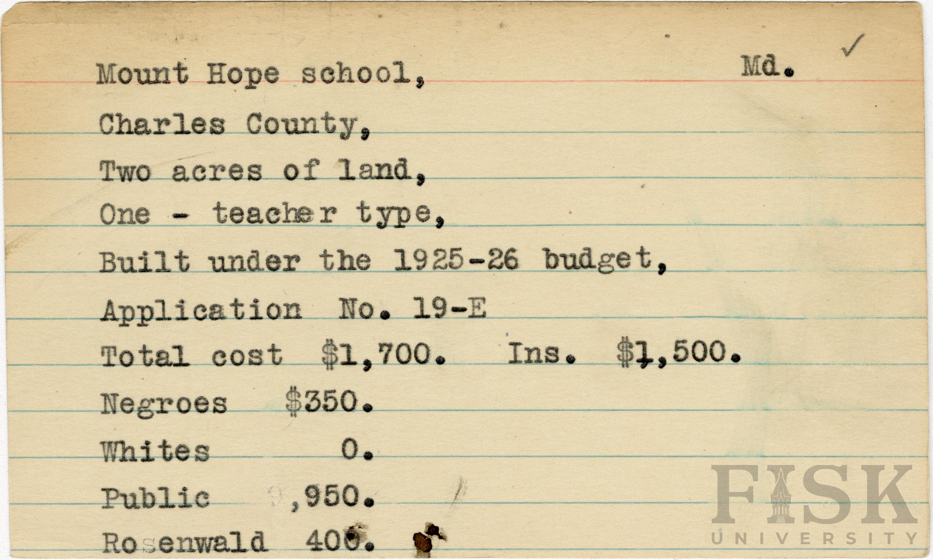 School card from Rosenwald Fund for Mount Hope School in Charles County, Maryland with a section added to the budget contributions that says, "Ins. $1,500"