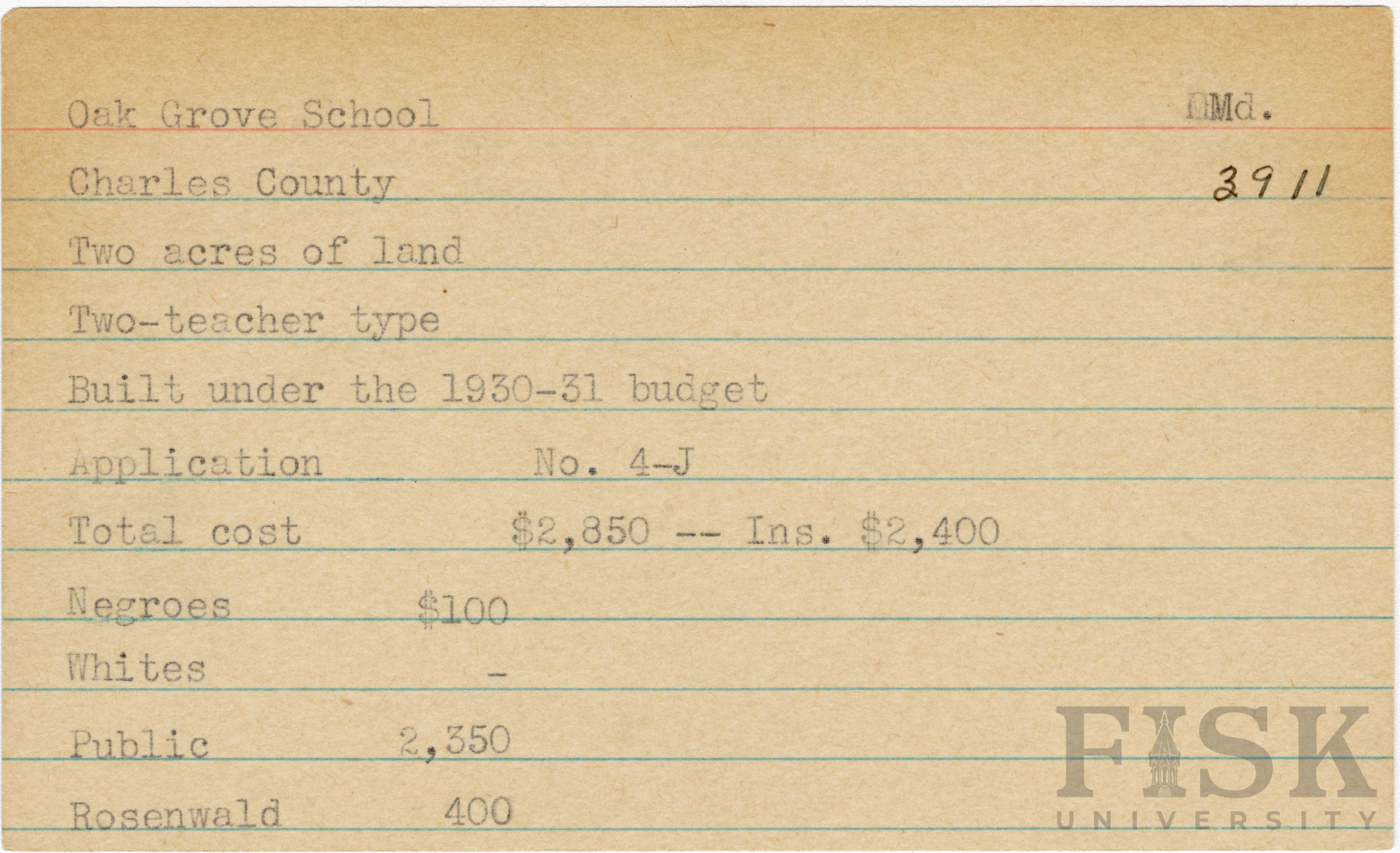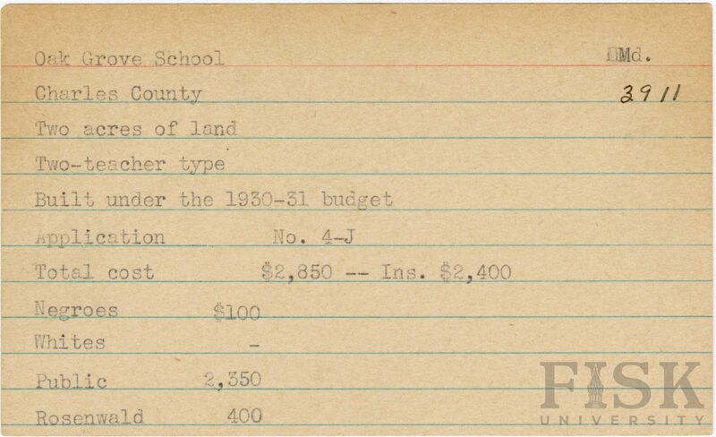 School card from Rosenwald Fund for Oak Grove School in Charles County, Maryland with a section added to the budget contributions that says, "Ins. $2,400"