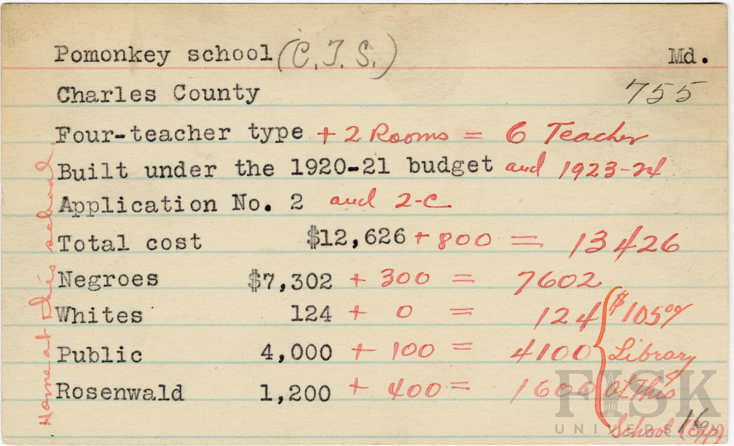 - School card from Rosenwald Fund for Pomonkey School in Charles County, Maryland with handwritten additions to the teacher type, budget year, application number, and budget contribution sections. Handwritten notes on the card say, "home at this school" and "$105.00 library at this school (Exp)"