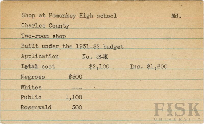 - School card from Rosenwald Fund for the two room shop at Pomonkey School in Charles County, Maryland with a section added to the budget contributions that says, "Ins. $1,600"