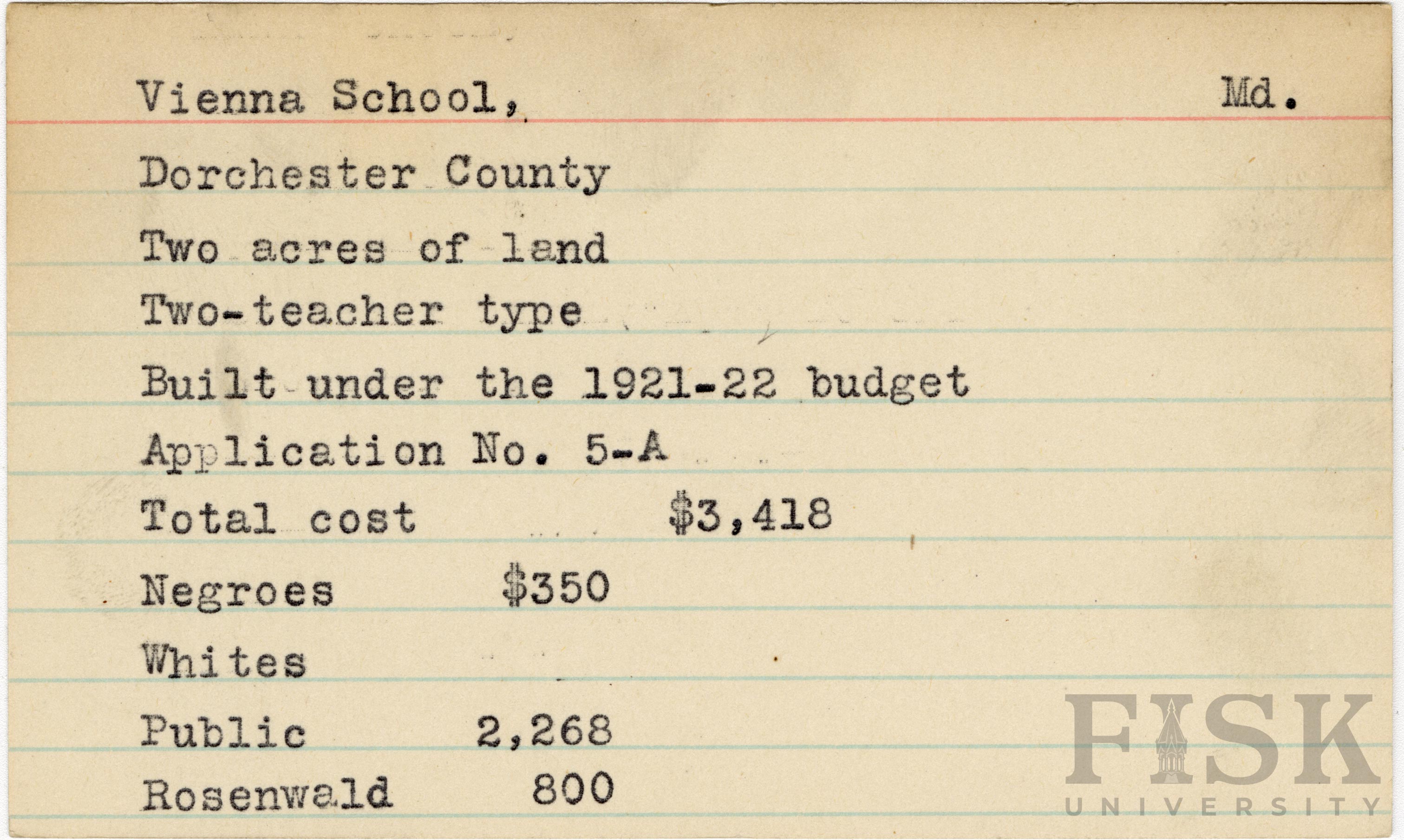 - School card from Rosenwald Fund for Vienna School in Dorchester County, Maryland