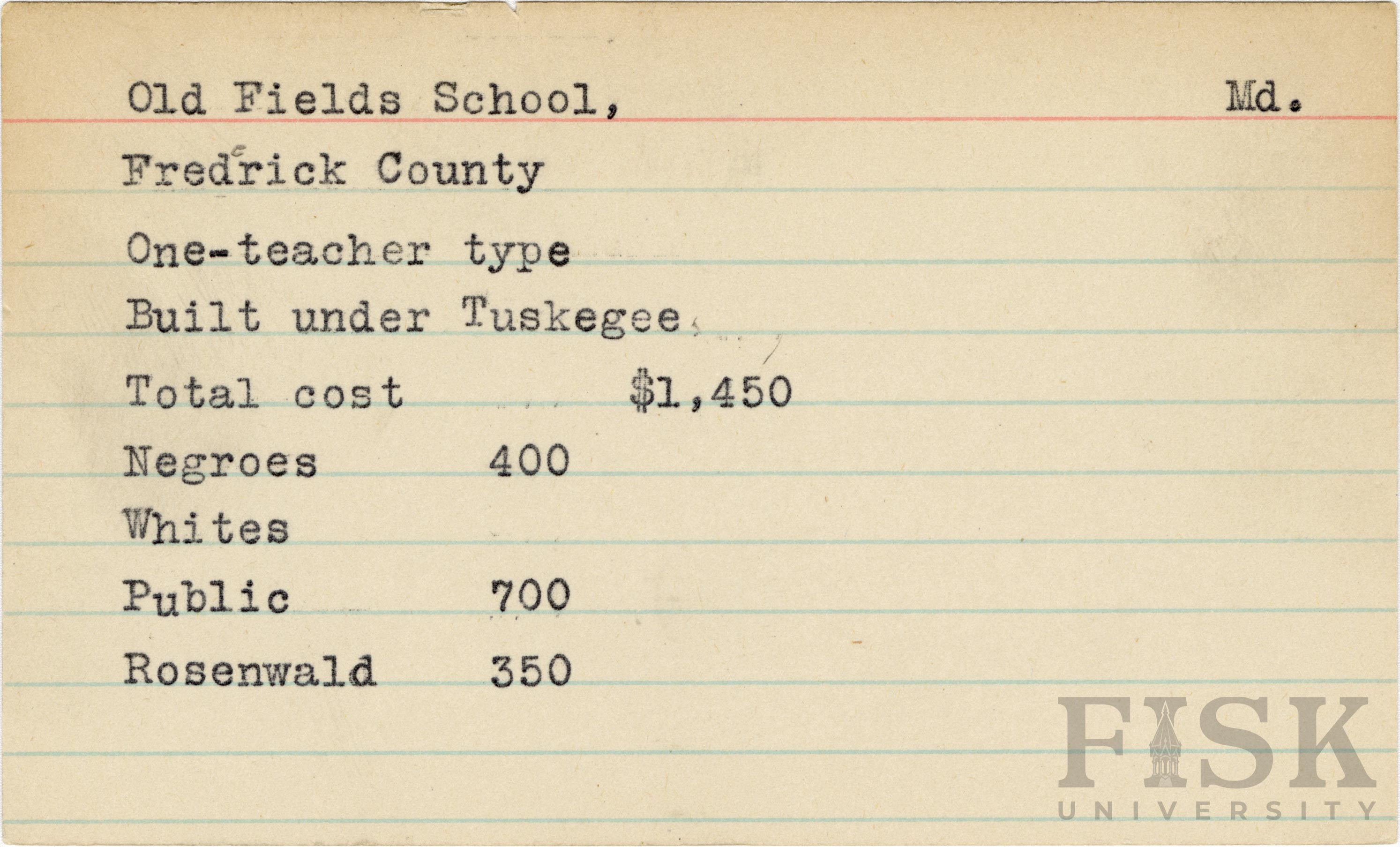 - School card from Rosenwald Fund for Old Fields School in Frederick County, Maryland