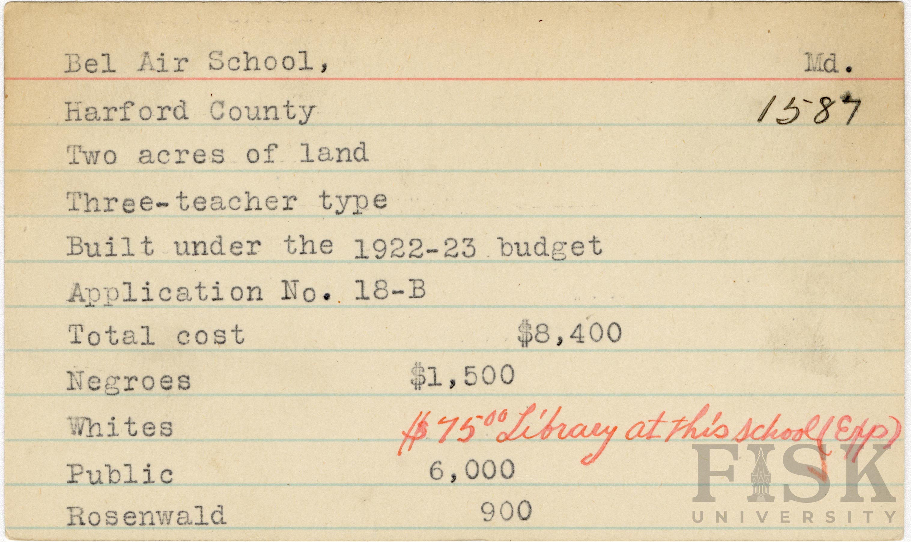 - School card from Rosenwald Fund for Bel Air School in Harford County, Maryland with a handwritten note that says, "$75.00 library at this school (Exp)"