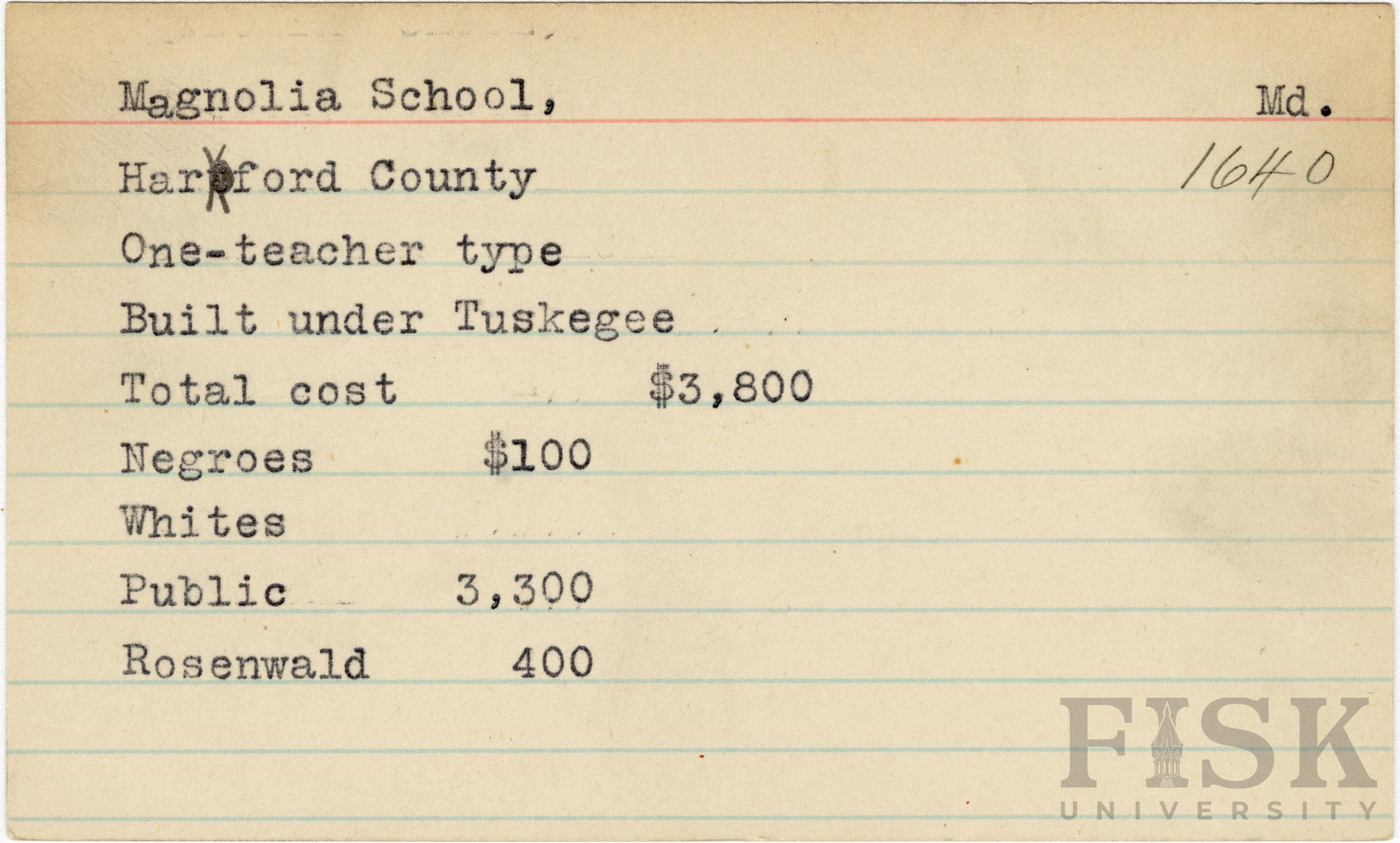 - School card from Rosenwald Fund for Magnolia School in Harford County, Maryland