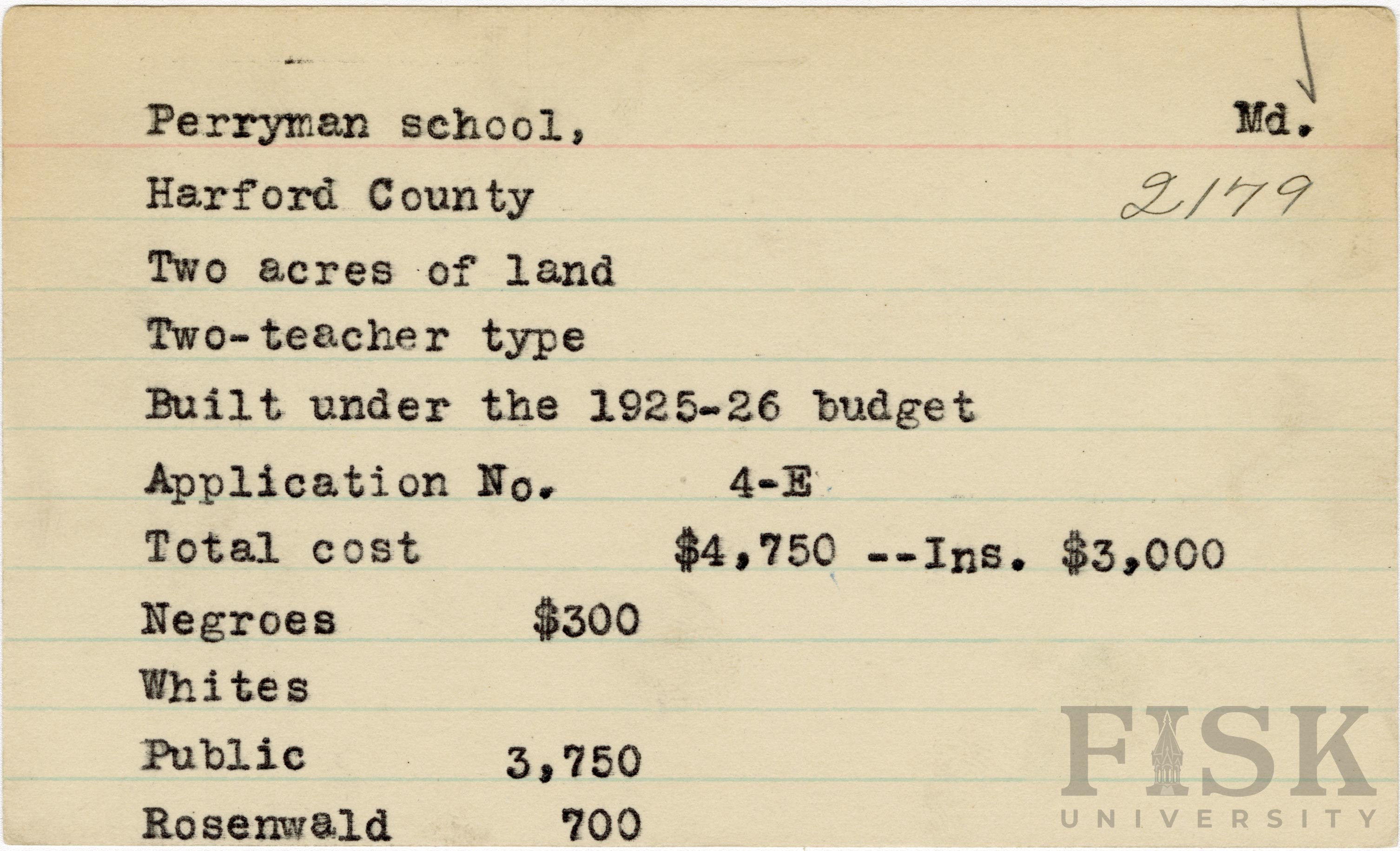 - School card from Rosenwald Fund for Perryman School in Harford County, Maryland with a section added to the budget contributions that says, "Ins. $3,000"