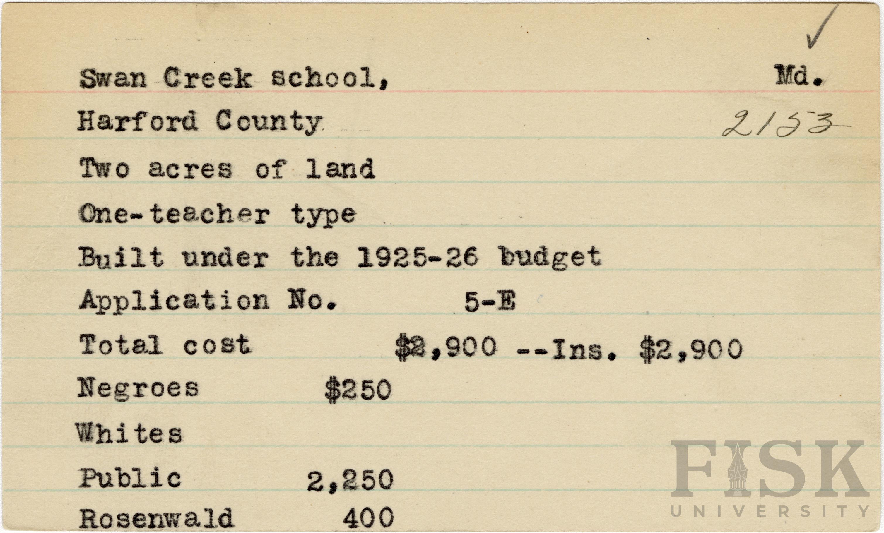 School card from Rosenwald Fund for Swan Creek School in Harford County, Maryland with a section added to the budget contributions that says, "Ins. $2,900"