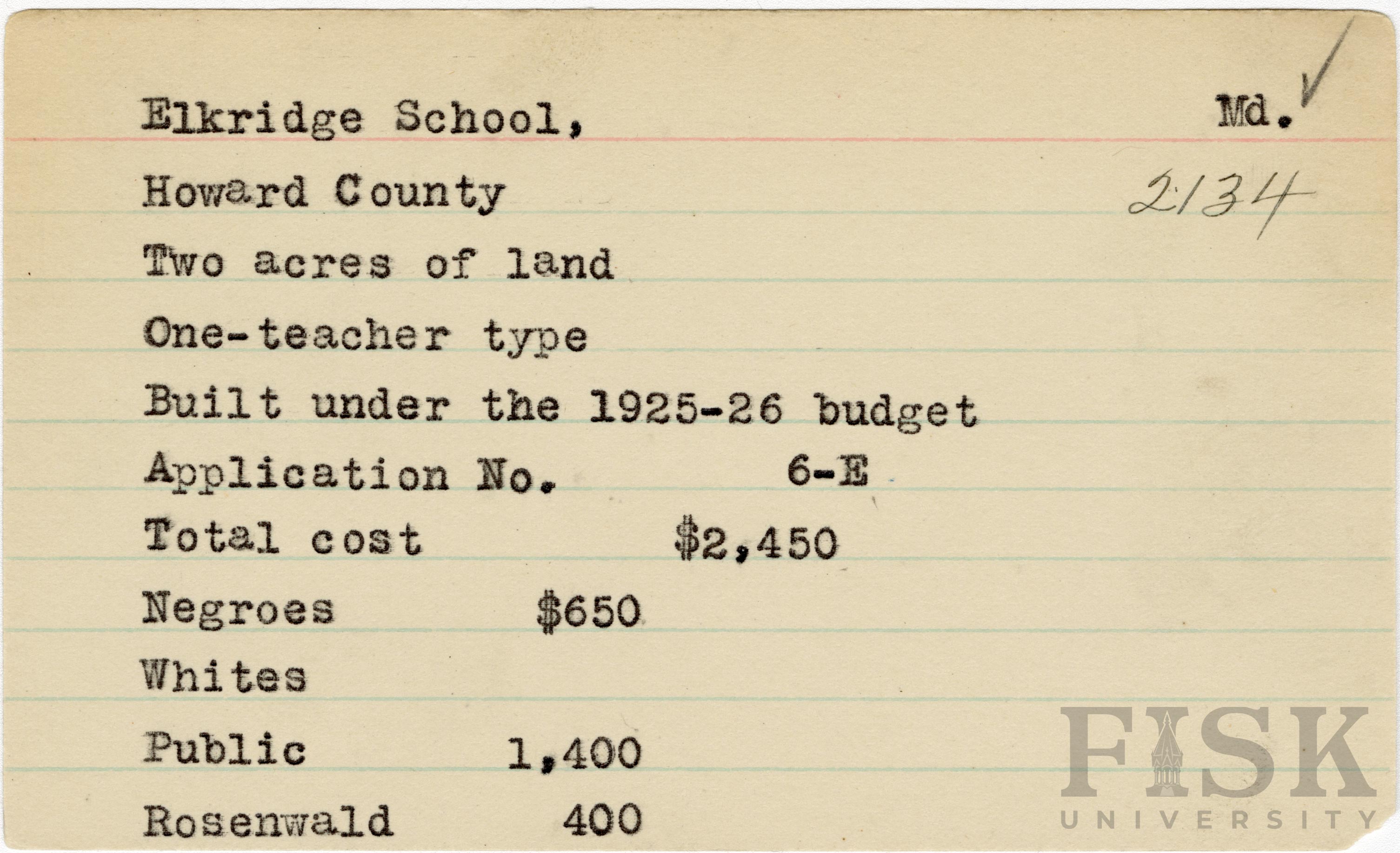 School card from Rosenwald Fund for Elkridge School in Howard County, Maryland