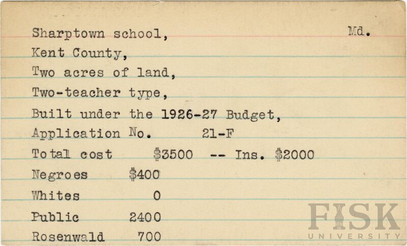 - School card from Rosenwald Fund for Sharptown School in Kent County, Maryland with a section added to the budget contributions that says, "Ins. $2,000"