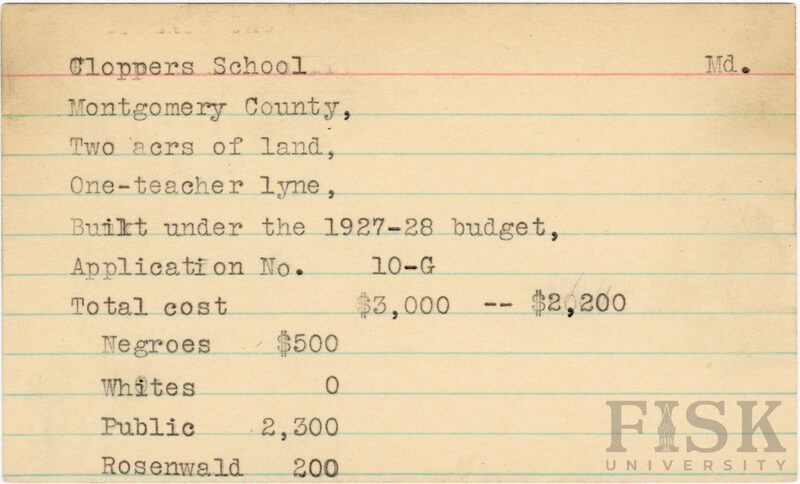 - School card from Rosenwald Fund for Cloppers School in Montgomery County, Maryland with a section added to the budget contributions that says, "$2,200"