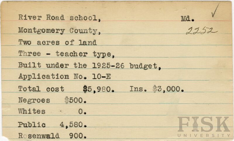 School card from Rosenwald Fund for River Road School in Montgomery County, Maryland with a section added to the budget contributions that says, "Ins. $3,000"
