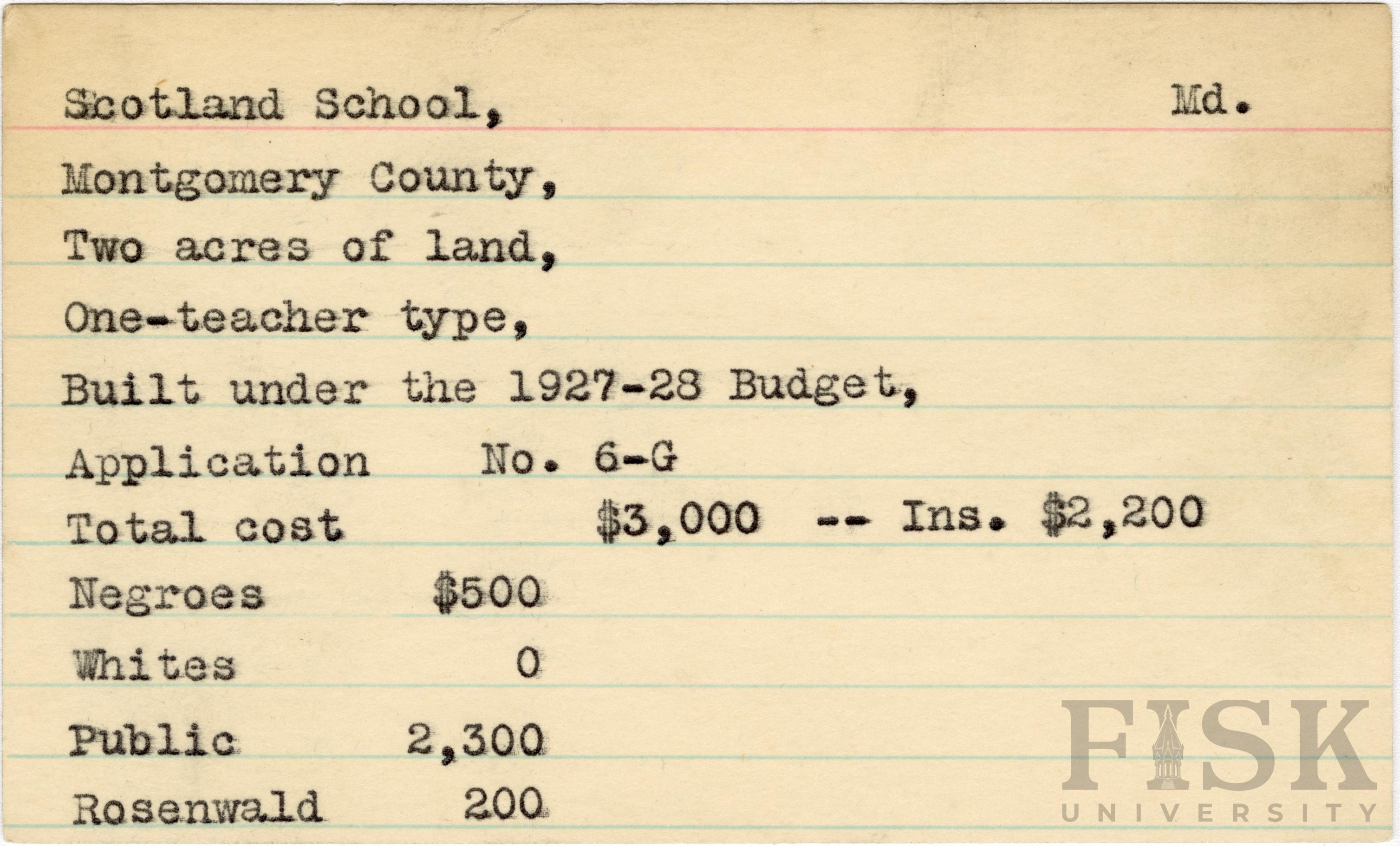 School card from Rosenwald Fund for Scotland School in Montgomery County, Maryland with a section added to the budget contributions that says, "Ins. $2,200"