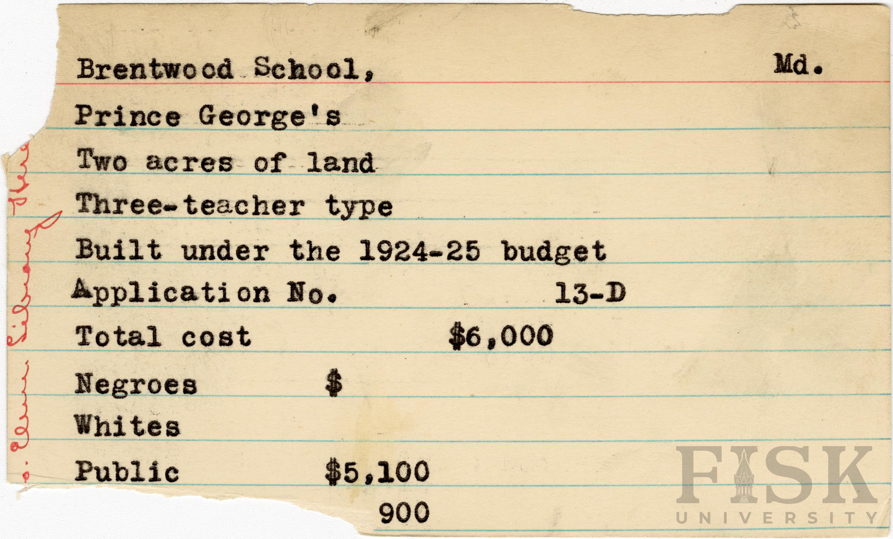 School card from Rosenwald Fund for Brentwood School in Prince George County, Maryland with a handwritten note that is partially cut off that says, "elem library here"