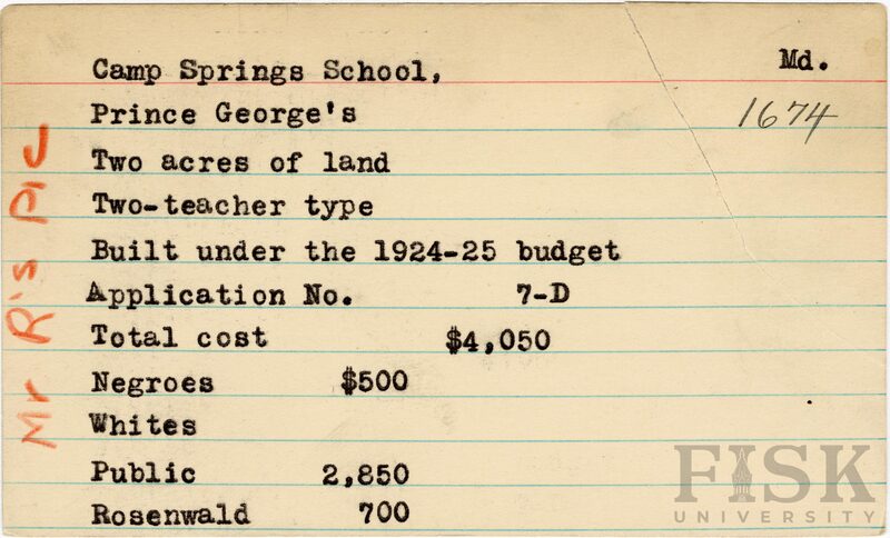 - School card from Rosenwald Fund for Camp Springs School in Prince George County, Maryland with a handwritten note on the far left of the card that says, "Mr. R's Pic"