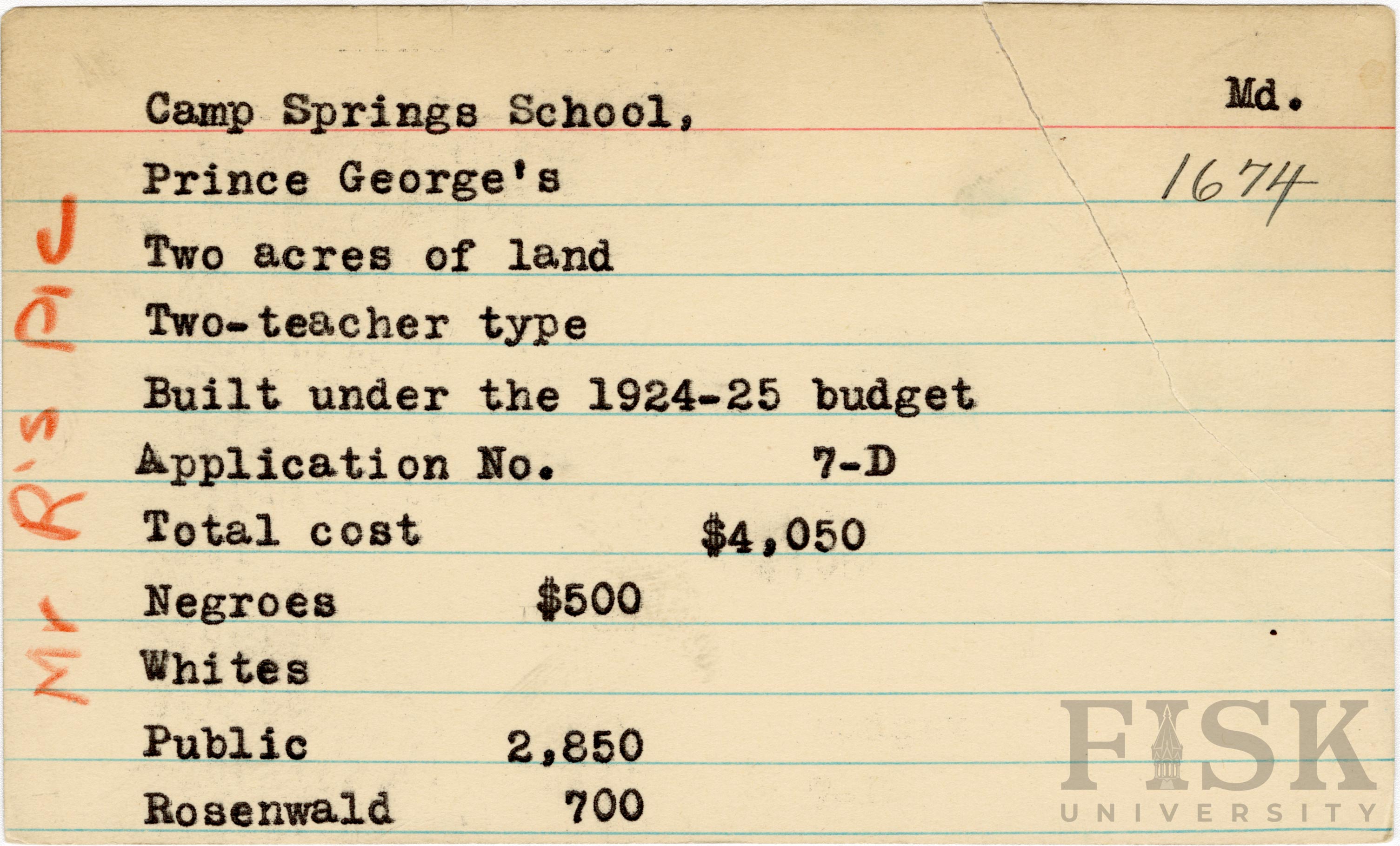 School card from Rosenwald Fund for Camp Springs School in Prince George County, Maryland with a handwritten note on the far left of the card that says, "Mr. R's Pic"