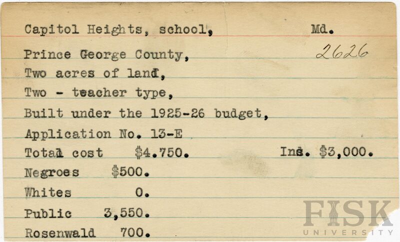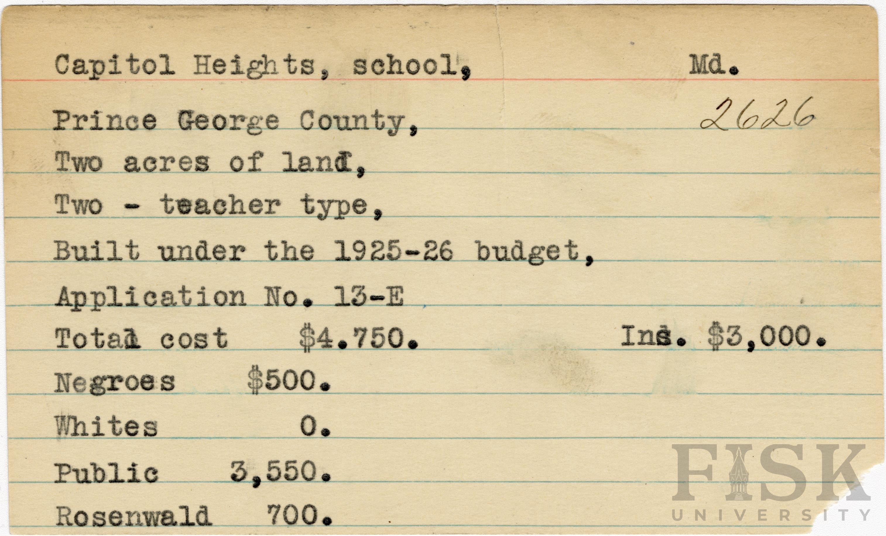 - School card from Rosenwald Fund for Capitol Heights School in Prince George County, Maryland with a section added to the budget contributions that says, "Ins. $3,000"