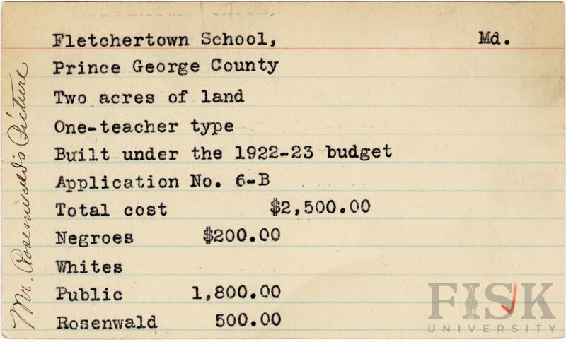- School card from Rosenwald Fund for Fletchertown School in Prince George County, Maryland with a handwritten note that says, "Mr. Rosenwald's Picture"