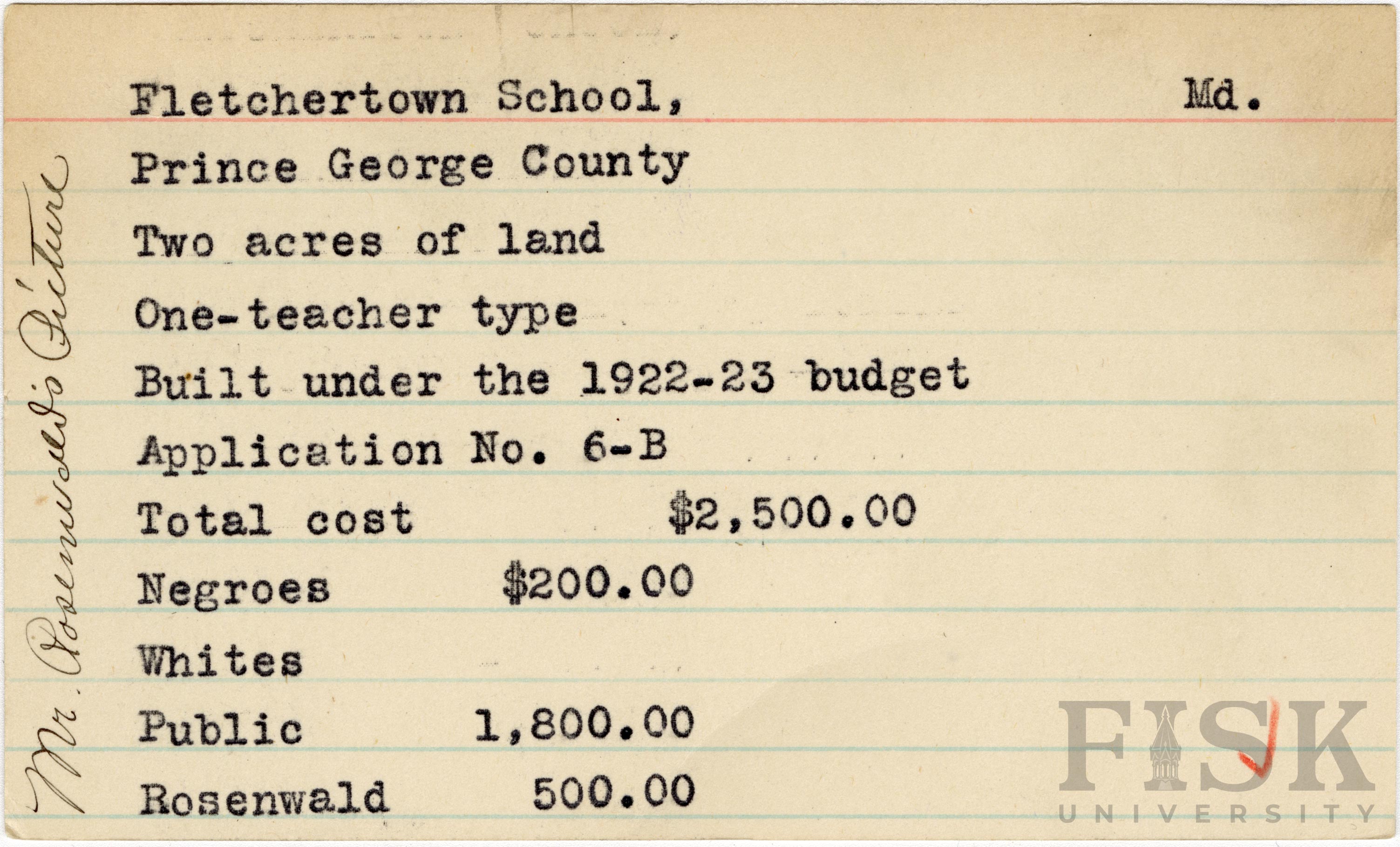 School card from Rosenwald Fund for Fletchertown School in Prince George County, Maryland with a handwritten note that says, "Mr. Rosenwald's Picture"