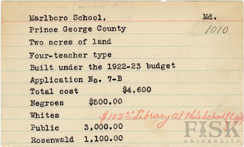 - School card from Rosenwald Fund for Marlboro School in Prince George County, Maryland with a handwritten note that says, "$105.00 library at this school (Exp)"