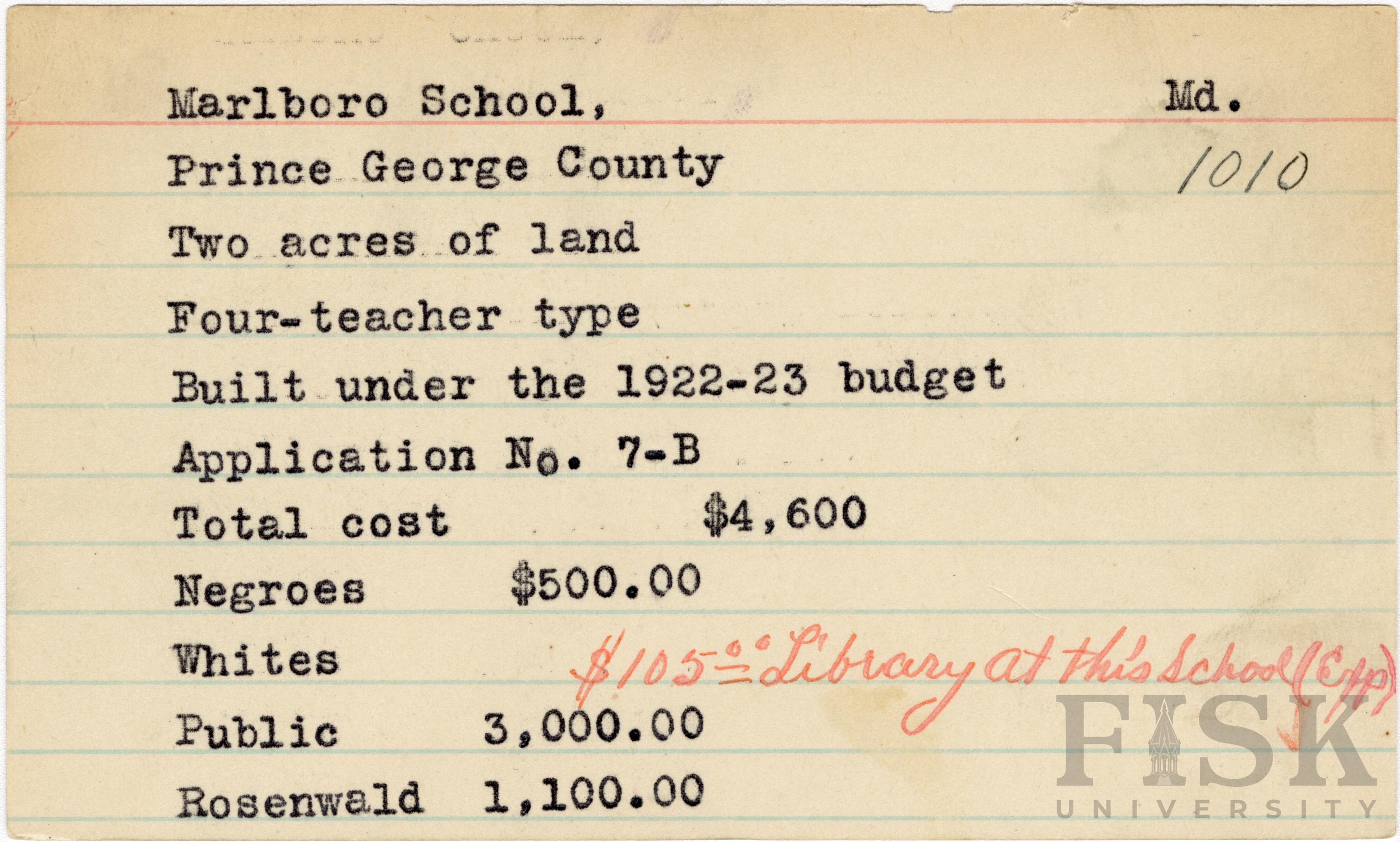 School card from Rosenwald Fund for Marlboro School in Prince George County, Maryland with a handwritten note that says, "$105.00 library at this school (Exp)"
