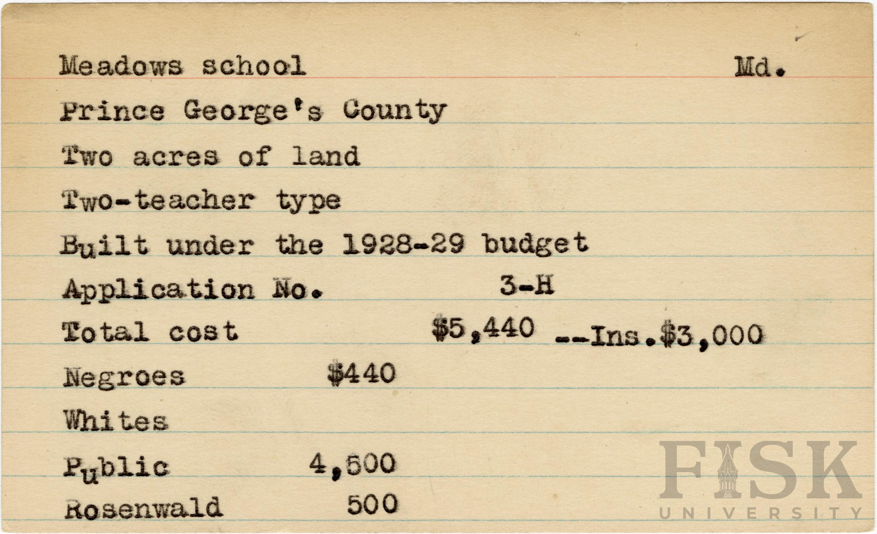 School card from Rosenwald Fund for Meadows School in Prince George County, Maryland with a section added to the budget contribution that says, "Ins. $3,000"