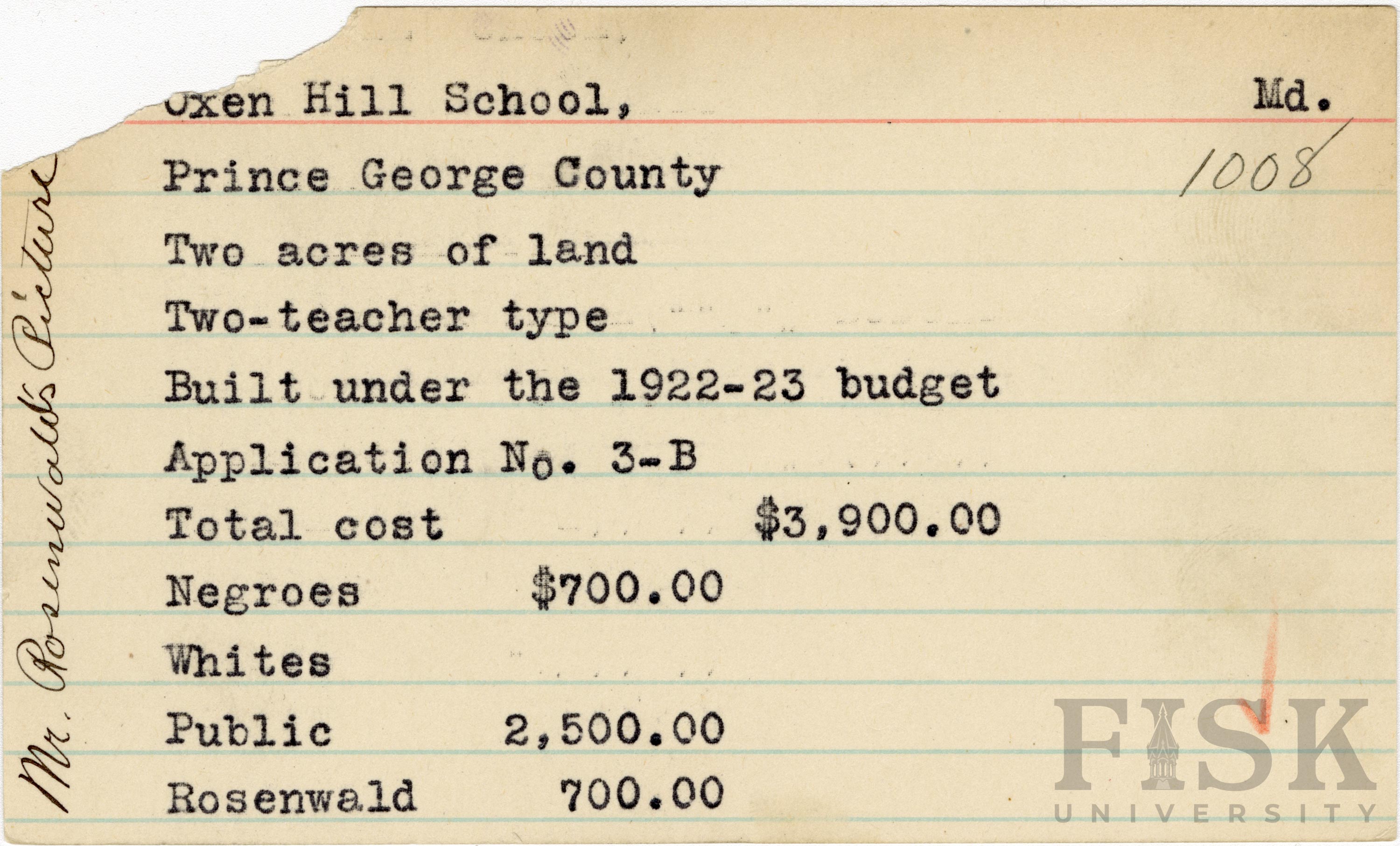 - School card from Rosenwald Fund for Oxen Hill School in Prince George County, Maryland with a handwritten note on the far left of the card that says, "Mr. Rosenwald's Picture"