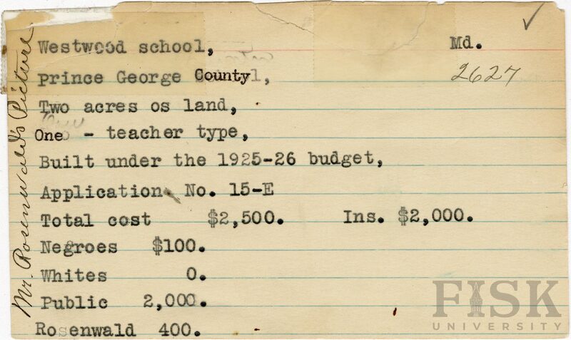 - School card from Rosenwald Fund for Westwood School in Prince George County, Maryland with a section added to the budget contributions that says, "Ins. $2,000" and a handwritte note on the far left of the card that says, "Mr. Rosenwald's Picture"