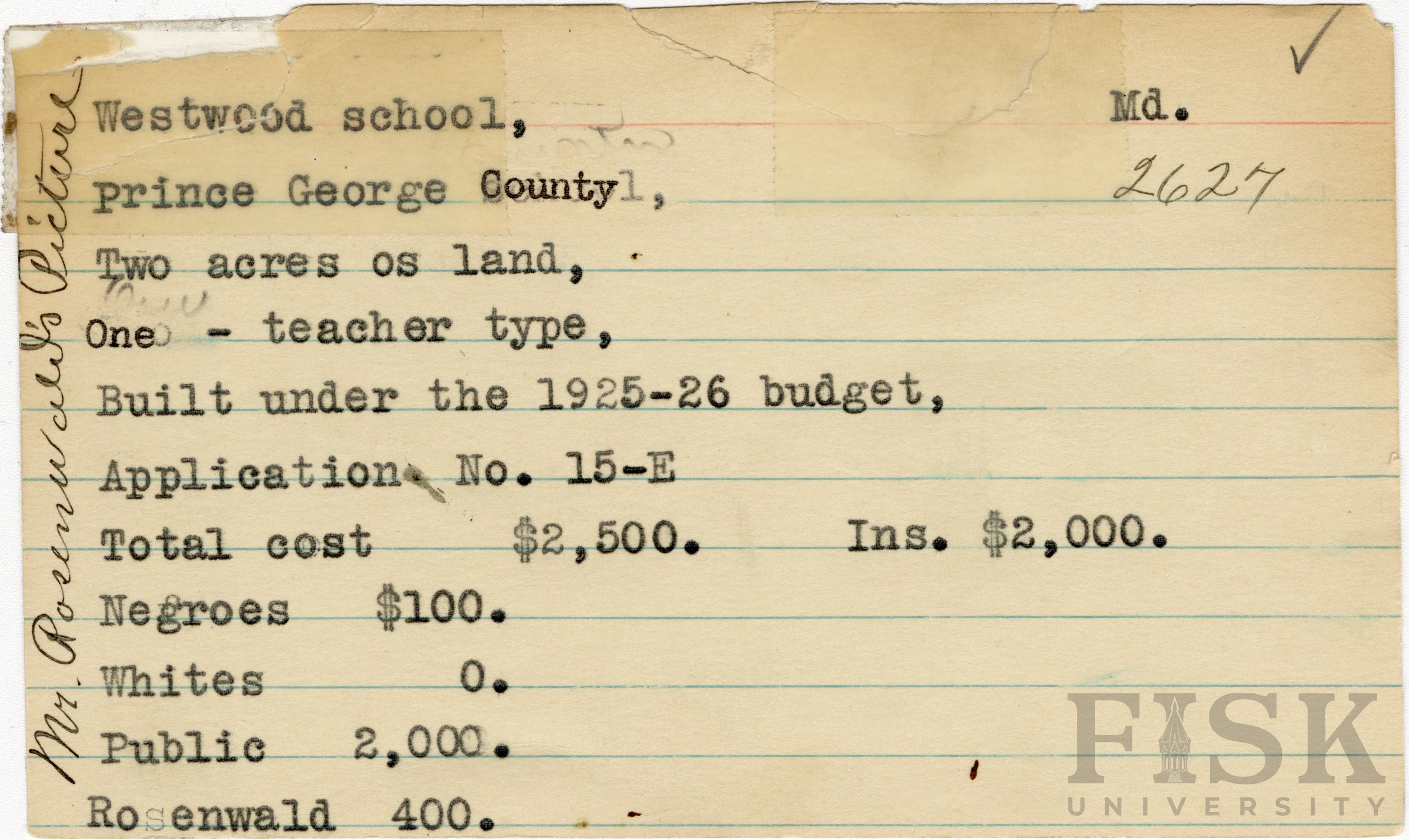 School card from Rosenwald Fund for Westwood School in Prince George County, Maryland with a section added to the budget contributions that says, "Ins. $2,000" and a handwritte note on the far left of the card that says, "Mr. Rosenwald's Picture"