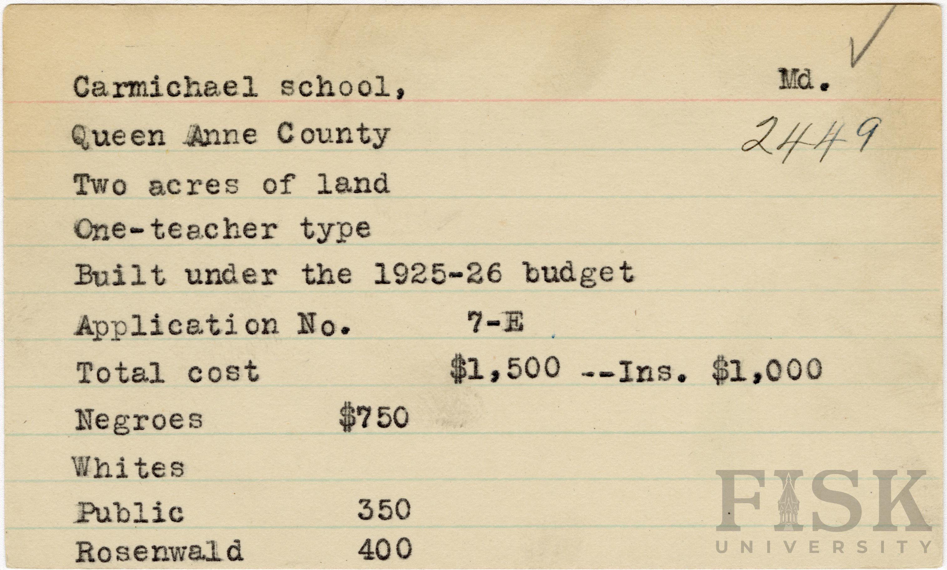 - School card from Rosenwald Fund for Carmichael School in Queen Anne County, Maryland with a section added to the budget contributions that says, "Ins. $1,000"