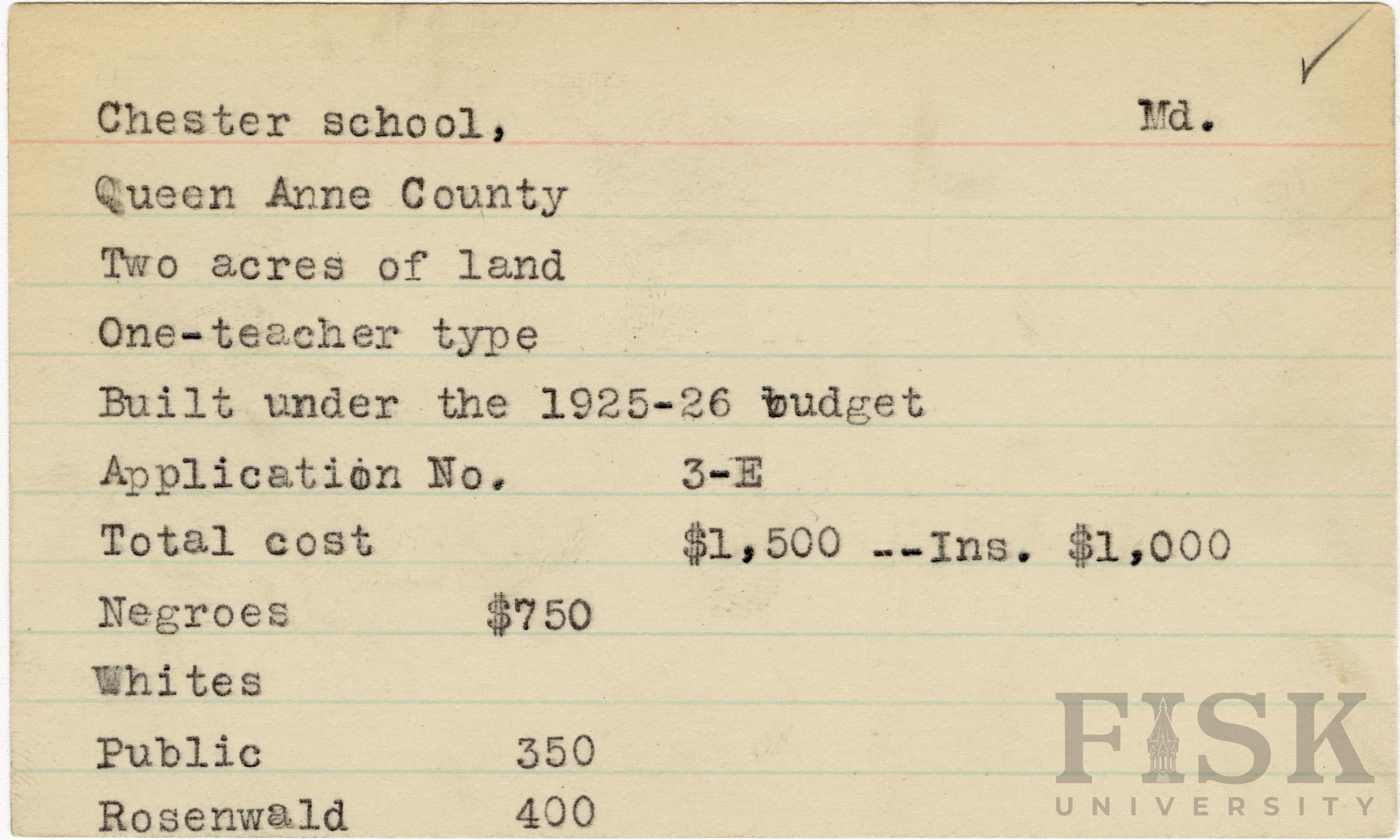 - School card from Rosenwald Fund for Chester School in Queen Anne County, Maryland with a section added to the budget contributions that says, "Ins. $1,000"