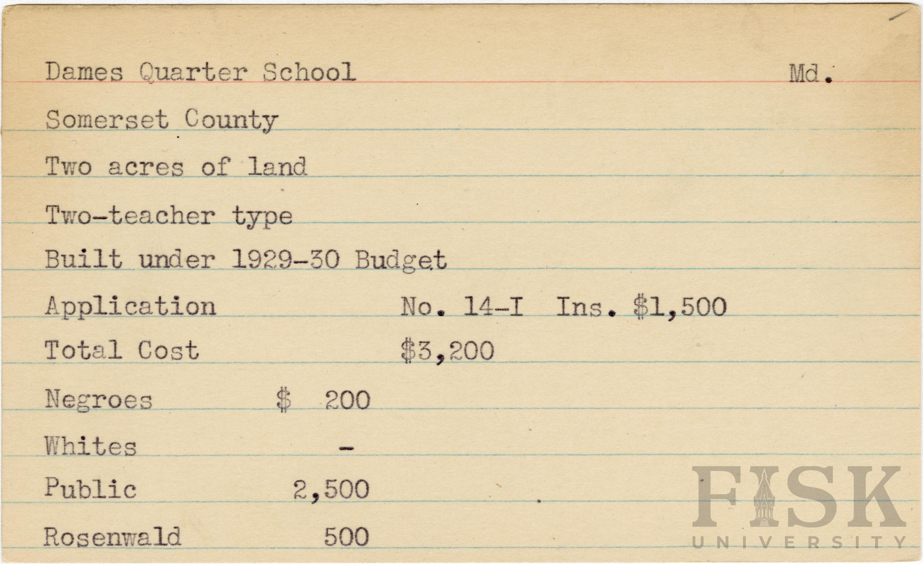 - School card from Rosenwald Fund for Dames Quarter School in Somerset County, Maryland with a section added to the budget contributions that says, "Ins. $1,500"