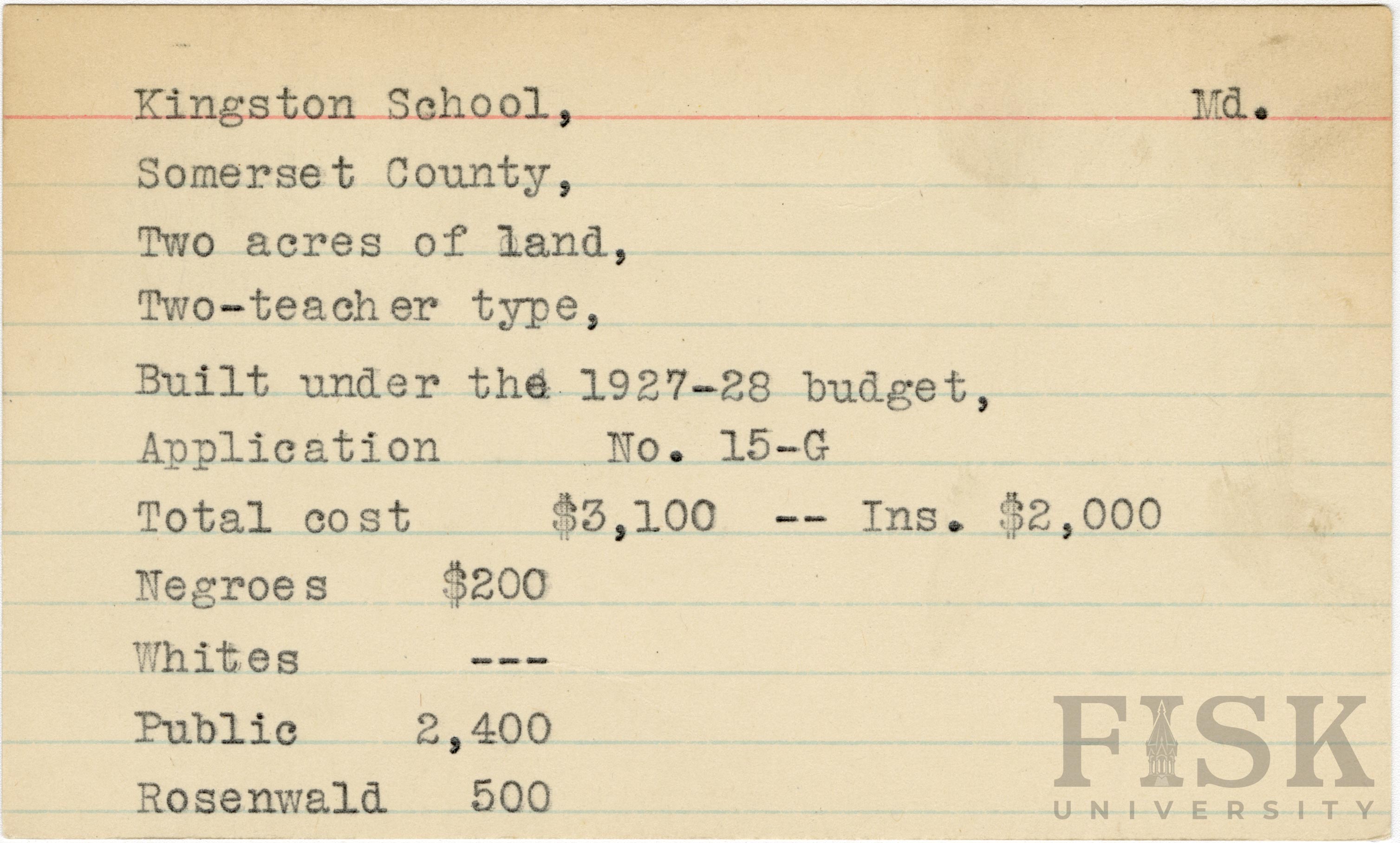 - School card from Rosenwald Fund for Kingston School in Somerset County, Maryland with a section added to the budget contributions that says, "Ins. $2,000"