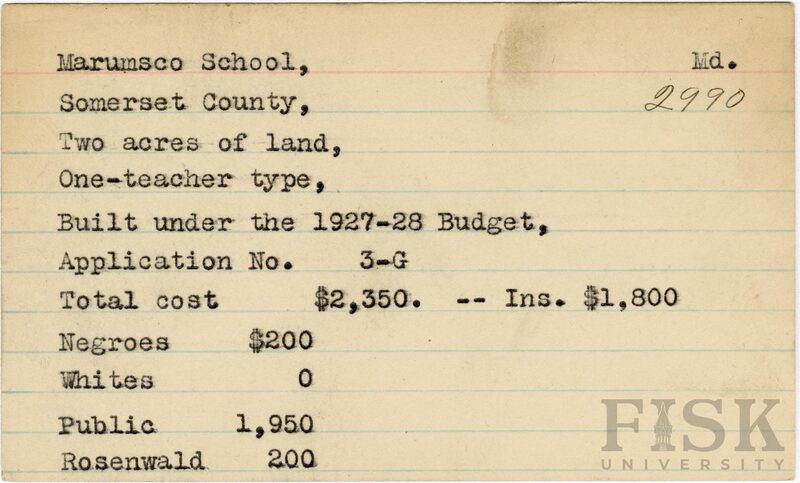 - School card from Rosenwald Fund for Marumsco School in Somerset County, Maryland with a section added to the budget contributions that says, "Ins. $1,800"