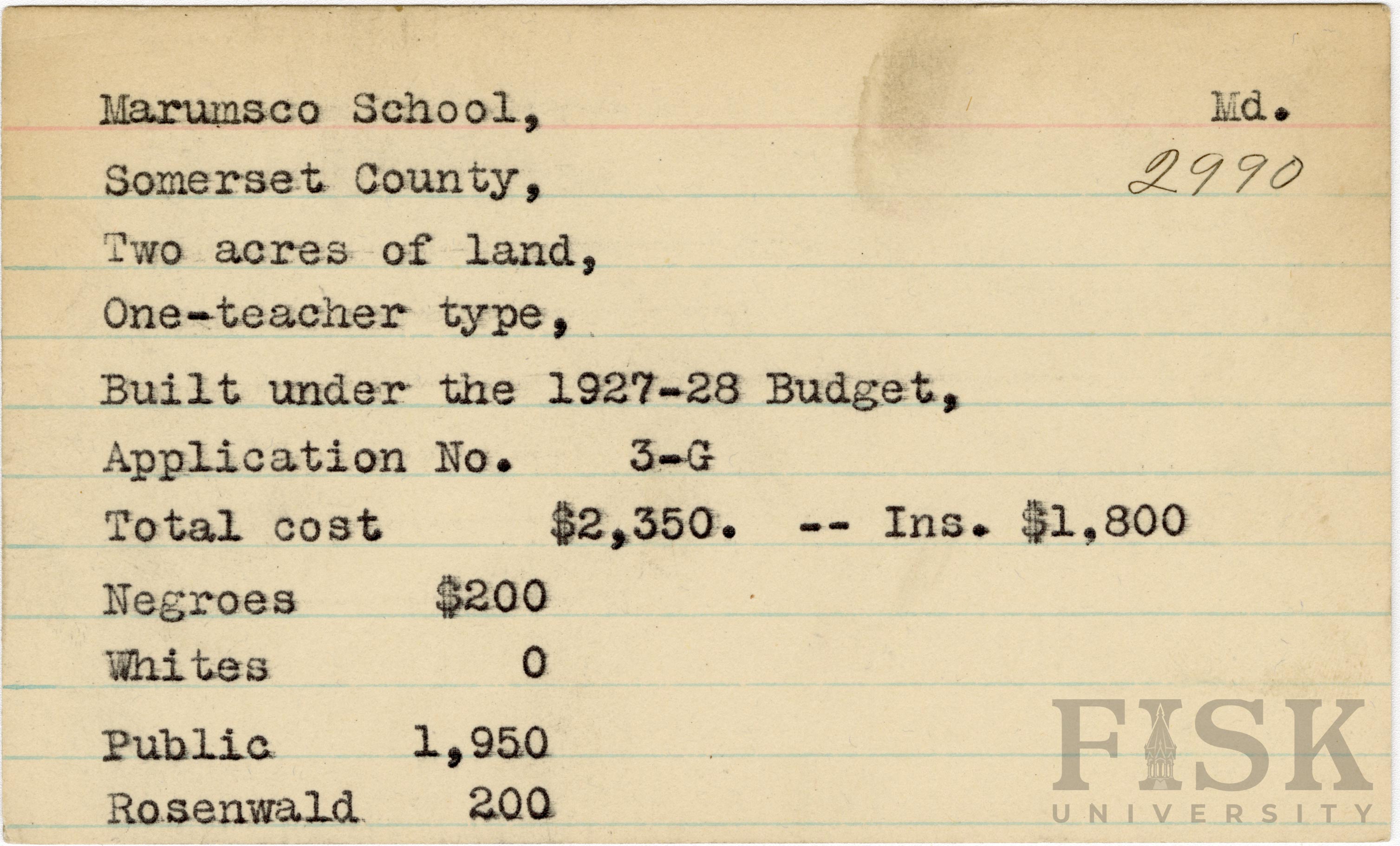 School card from Rosenwald Fund for Marumsco School in Somerset County, Maryland with a section added to the budget contributions that says, "Ins. $1,800"