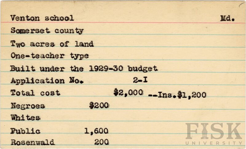 School card from Rosenwald Fund for Venton School in Somerset County, Maryland with a section added to the budget contributions that says, "Ins. $1,200"