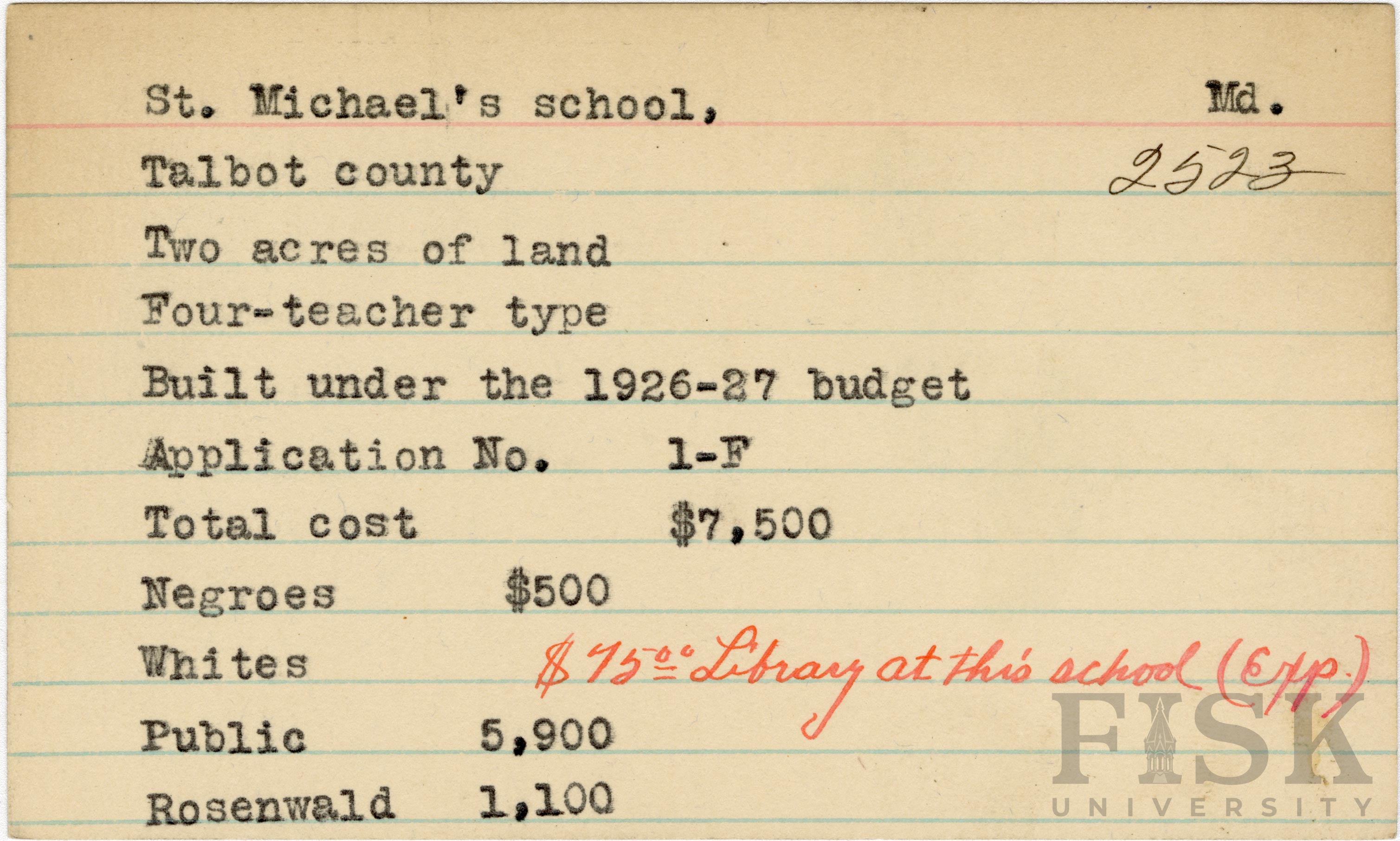 School card from Rosenwald Fund for St. Michael's School in Talbot County, Maryland with a handwritten note that says, "$75.00 library at this school (Exp)"
