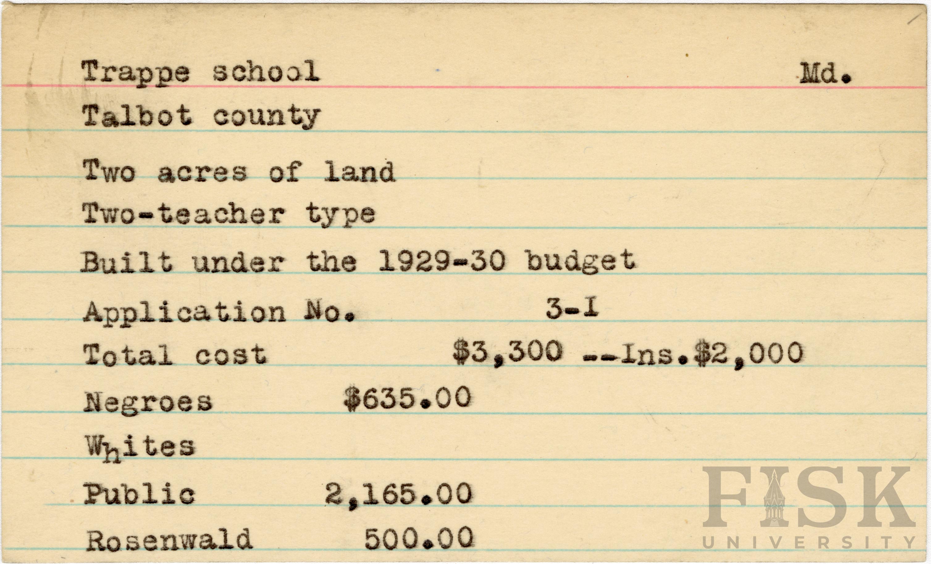- School card from Rosenwald Fund for Trappe School in Talbot County, Maryland with a section added to the budget contributions that says, "Ins. $2,000"