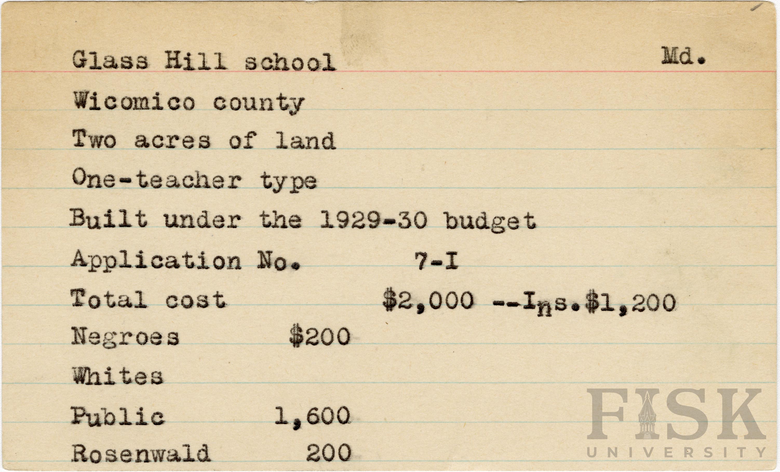 - School card from Rosenwald Fund for Glass Hill School in Wicomico County, Maryland with a section added to the budget contributions that says, "Ins. $1,200"