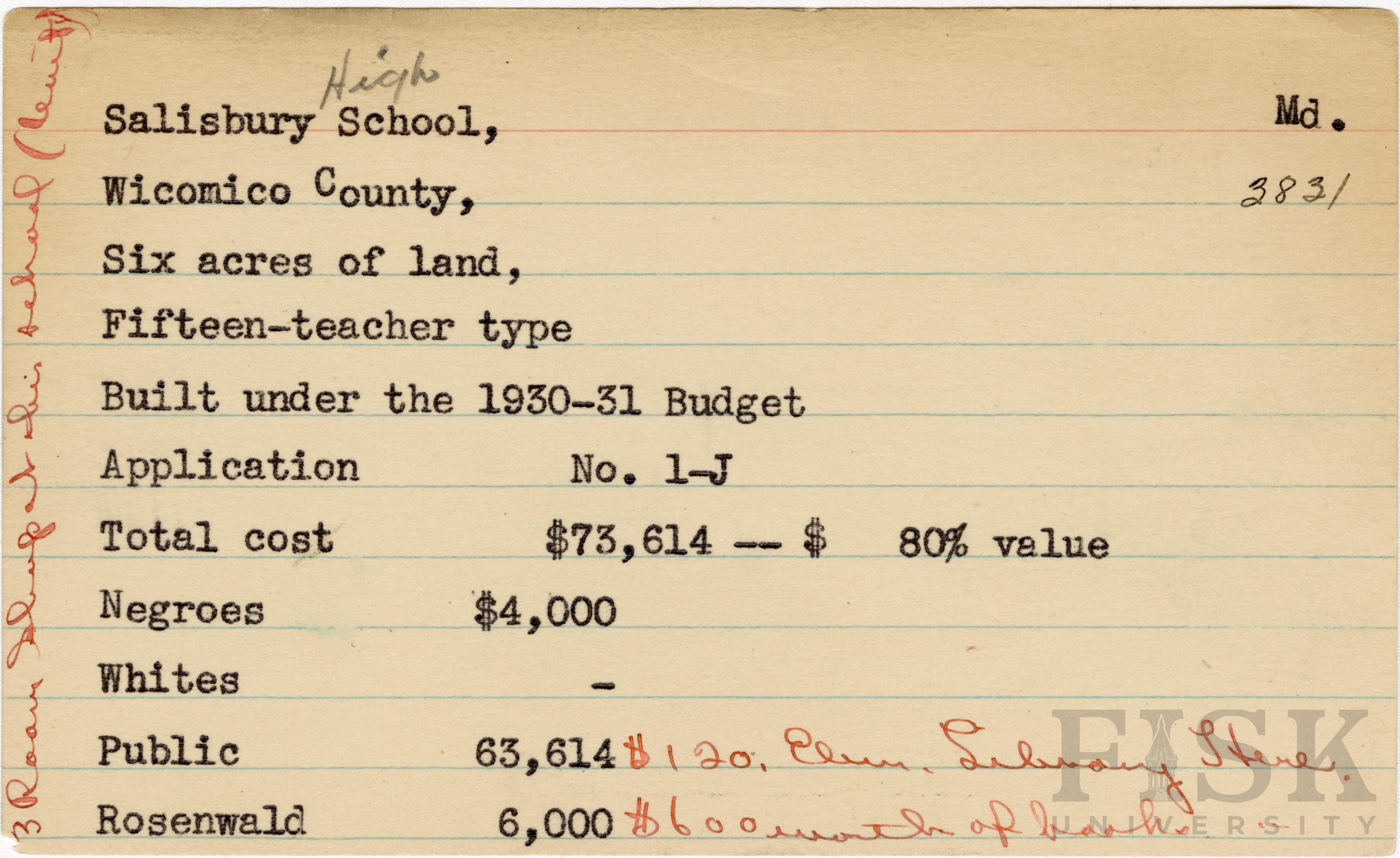 School card from Rosenwald Fund for Salisbury High School in Wicomico County, Maryland with handwritten notes that say, "3 room shop at this school," "$120 elem library here," and "$600 worth of books"