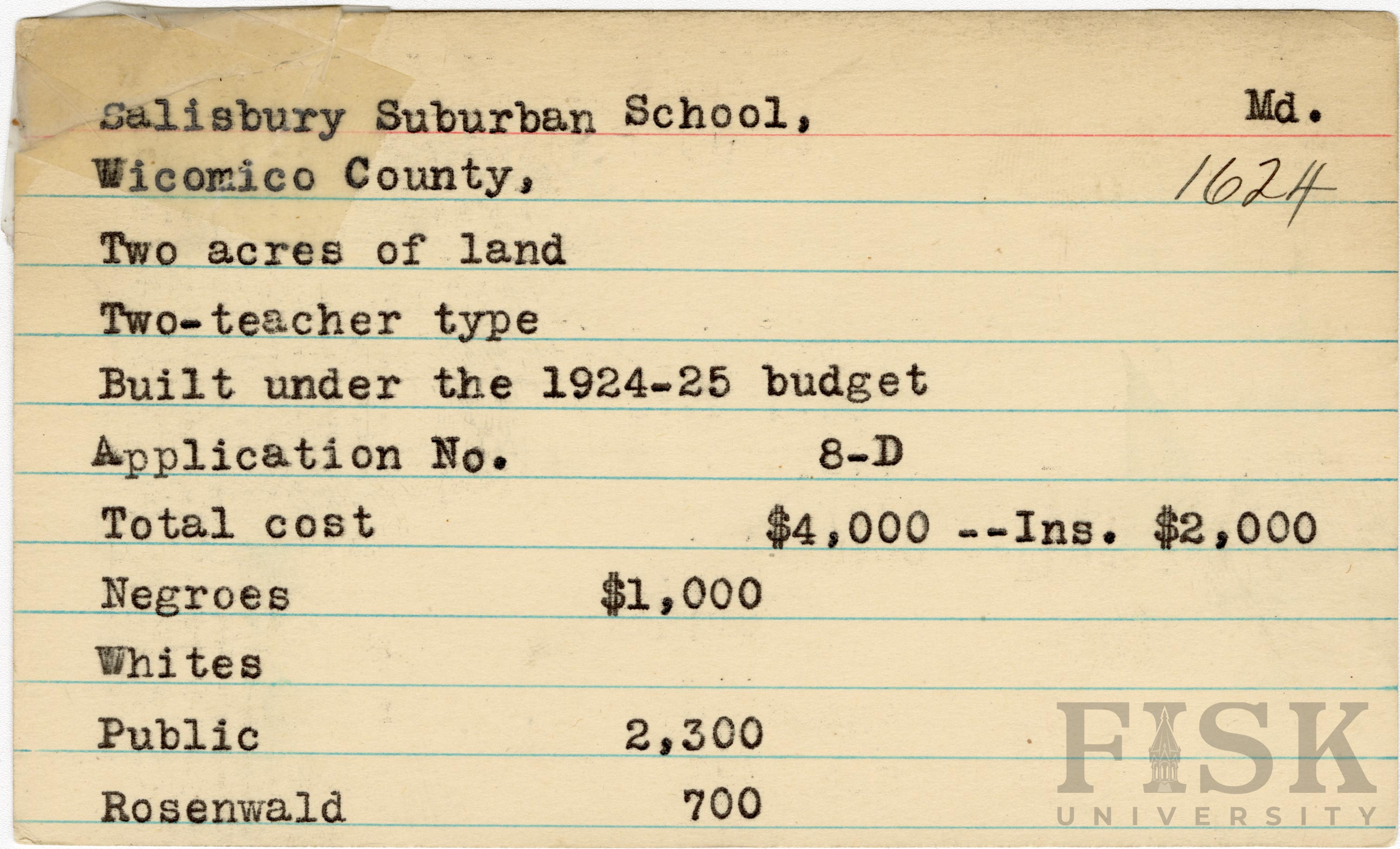 - School card from Rosenwald Fund for Salisbury Suburban School in Wicomico County, Maryland with a section added to the budget contributions that says, "Ins. $2,000"