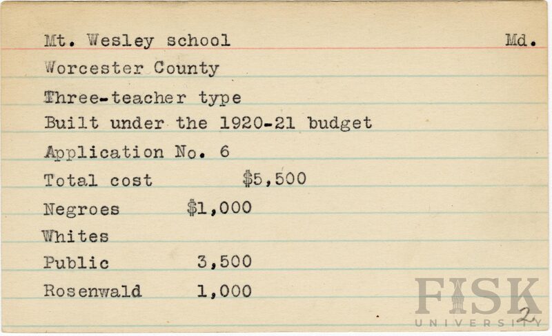 School card from Rosenwald Fund for Mt. Wesley School in Worcester County, Maryland
