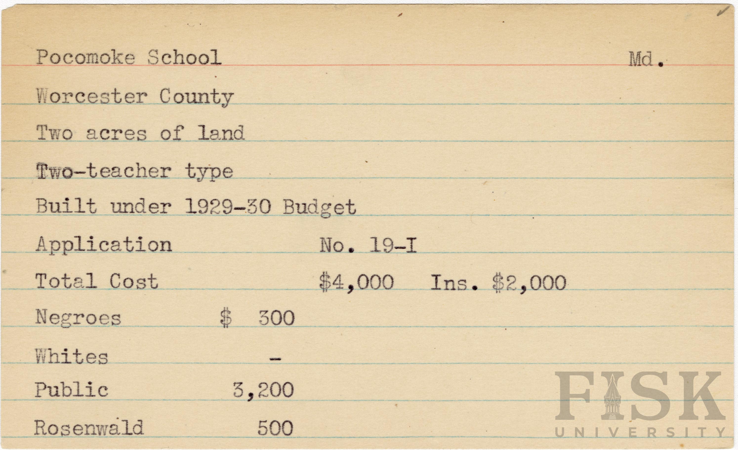 School card from Rosenwald Fund for Pocomoke School in Worcester County, Maryland with a section added to the budget contributions that says, "Ins. $2,000"