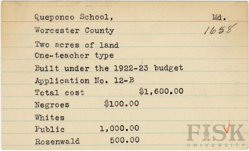 - School card from Rosenwald Fund for Queponco School in Worcester County, Maryland