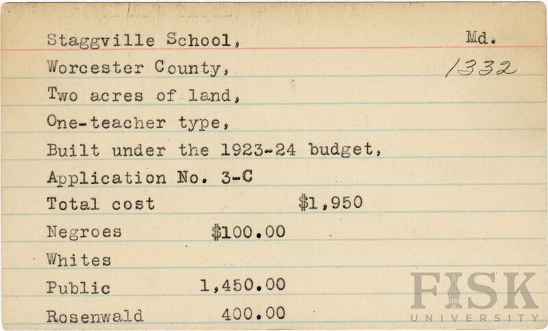 - School card from Rosenwald Fund for Staggville School in Worcester County, Maryland