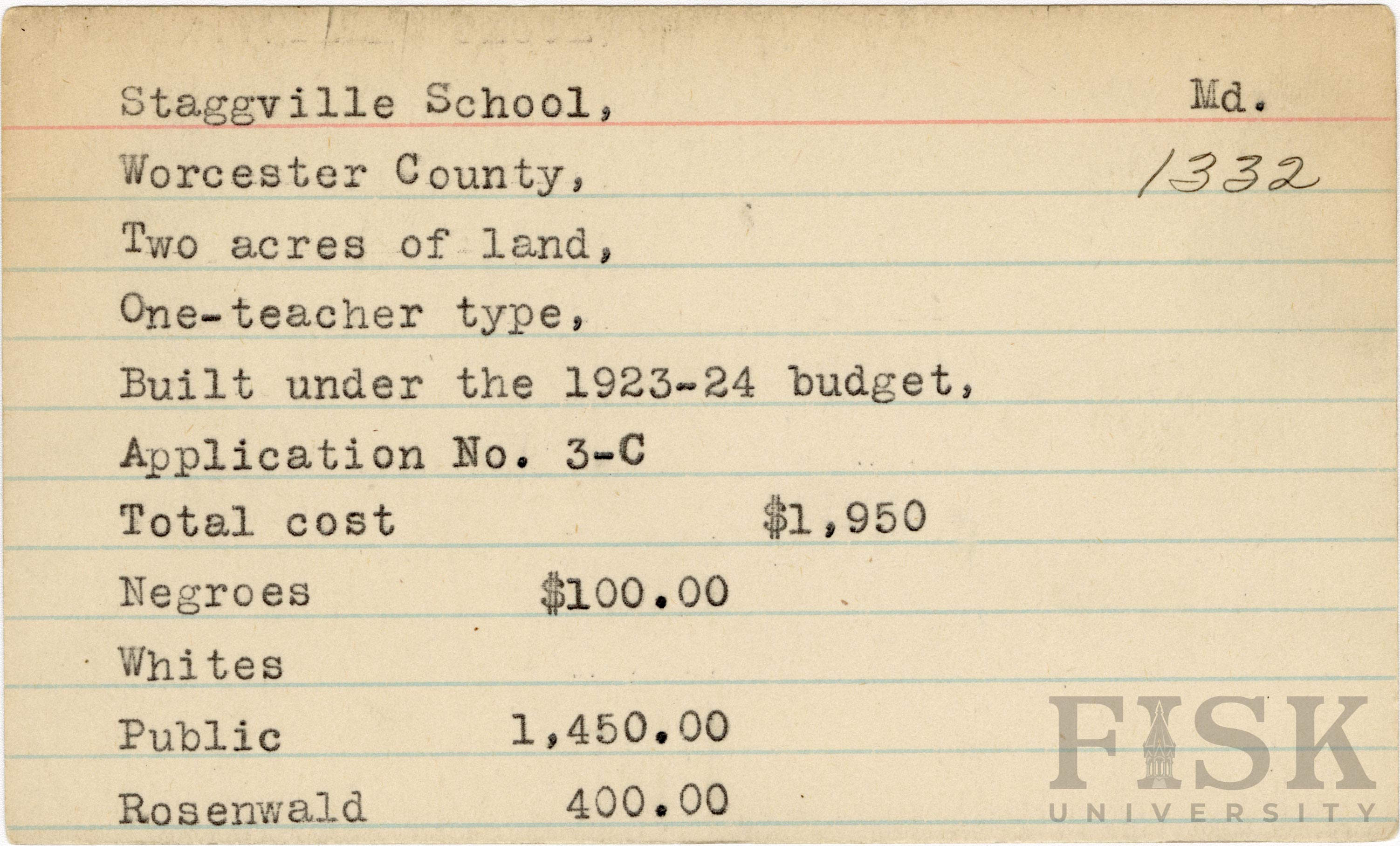 School card from Rosenwald Fund for Staggville School in Worcester County, Maryland