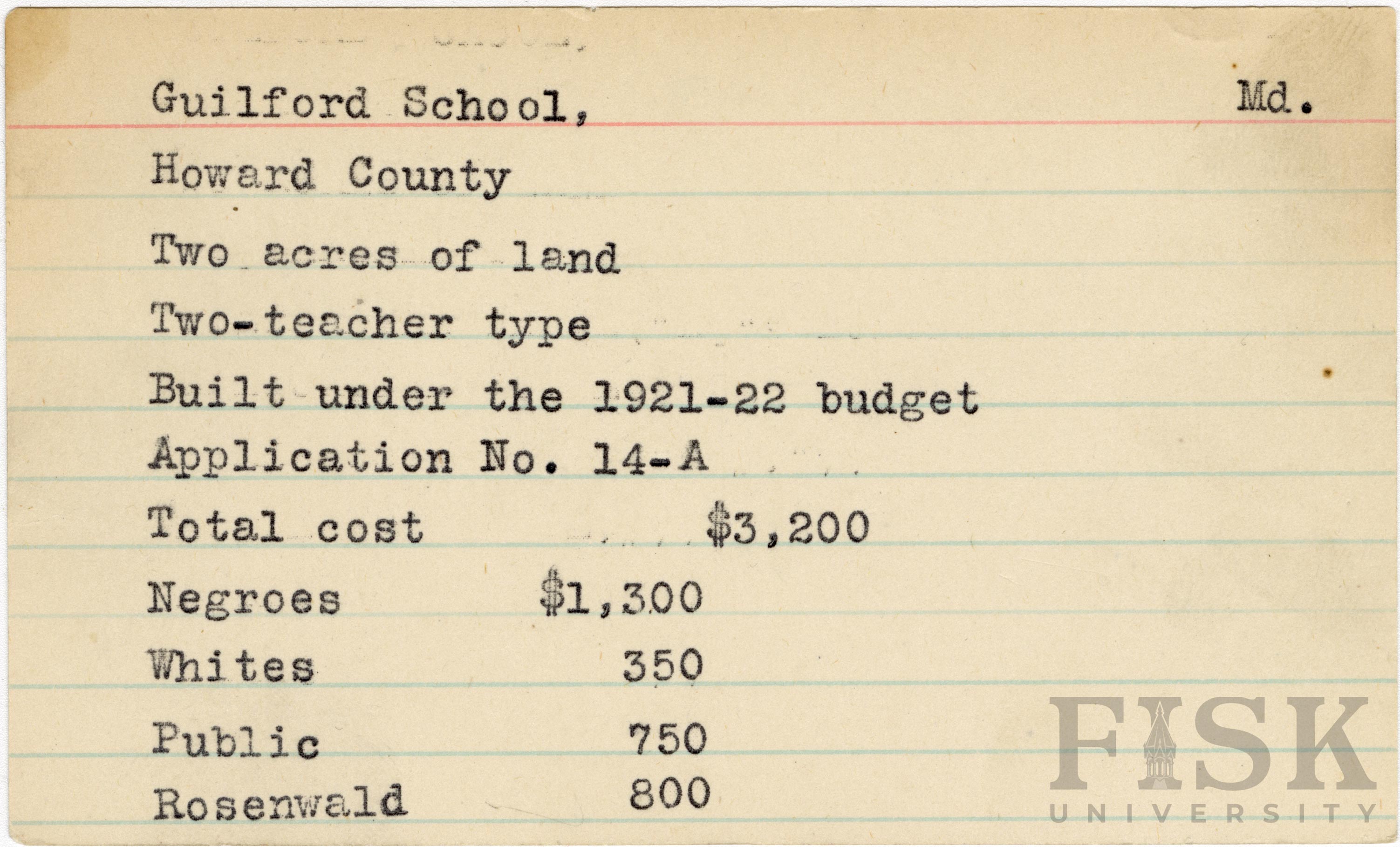 - School card from Rosenwald Fund for Guilford School in Howard County, Maryland