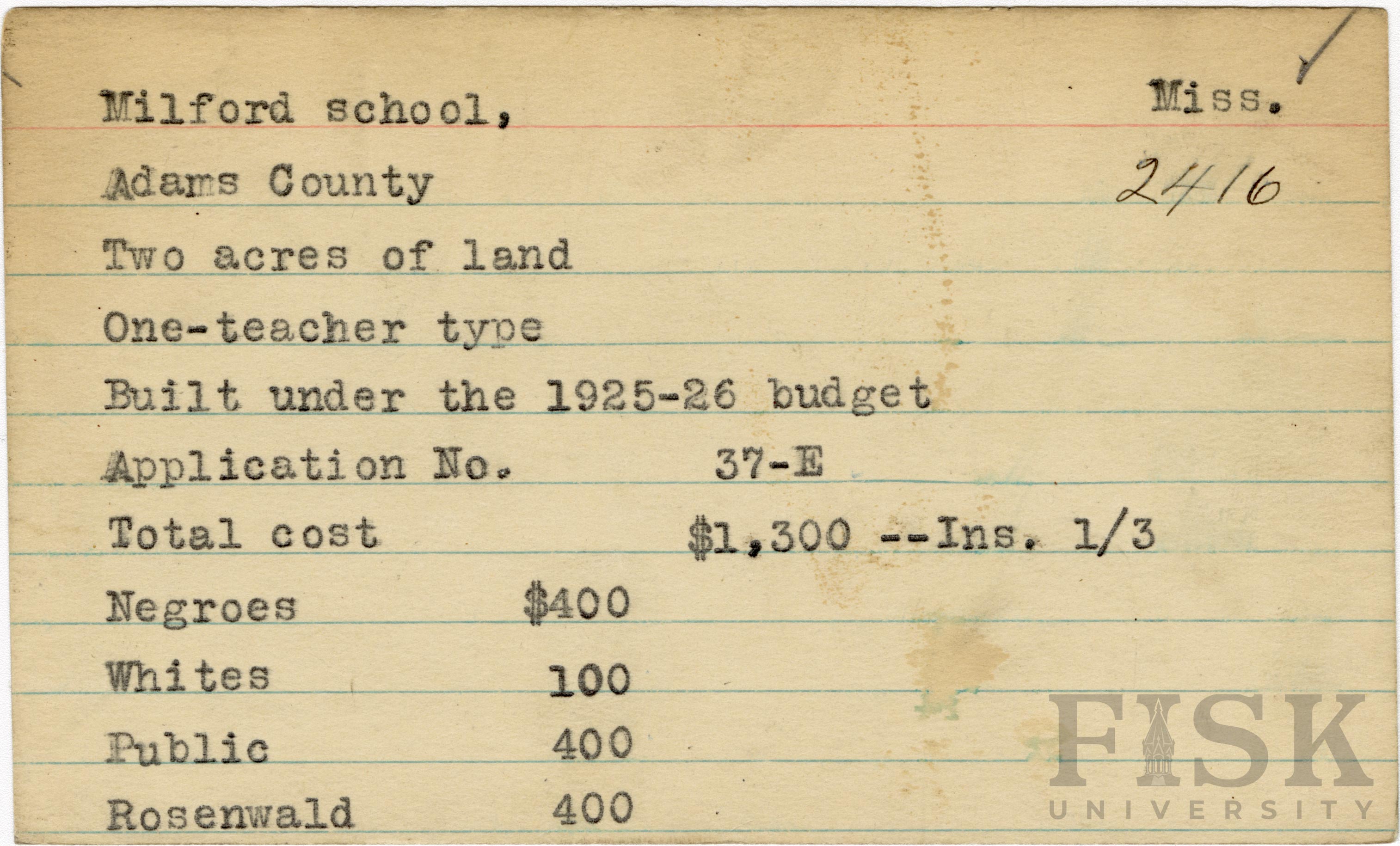 - School card from Rosenwald Fund for Milford School in Adams County, Mississippi with a section added to the budget contributions that says, "Ins. 1/3"