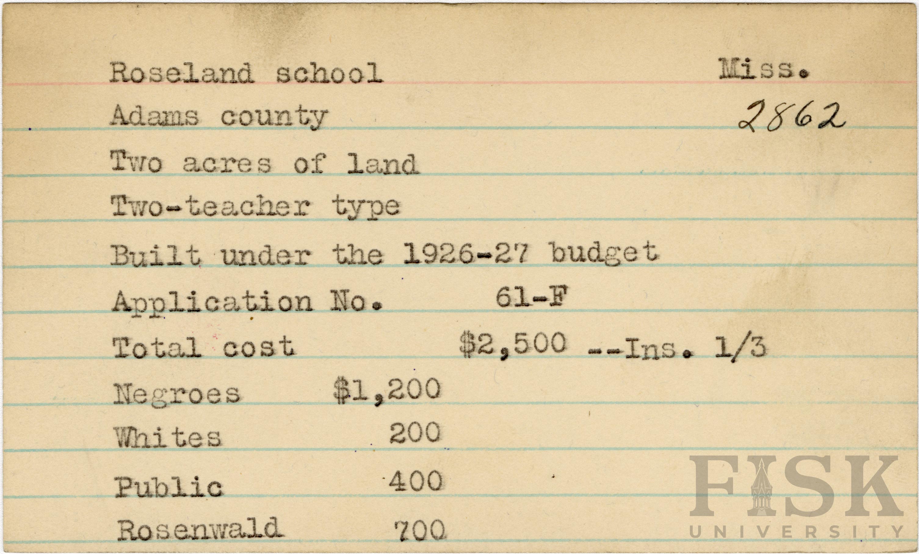 - School card from Rosenwald Fund for Roseland School in Adams County, Mississippi with a section added to the budget contributions that says, "Ins. 1/3"